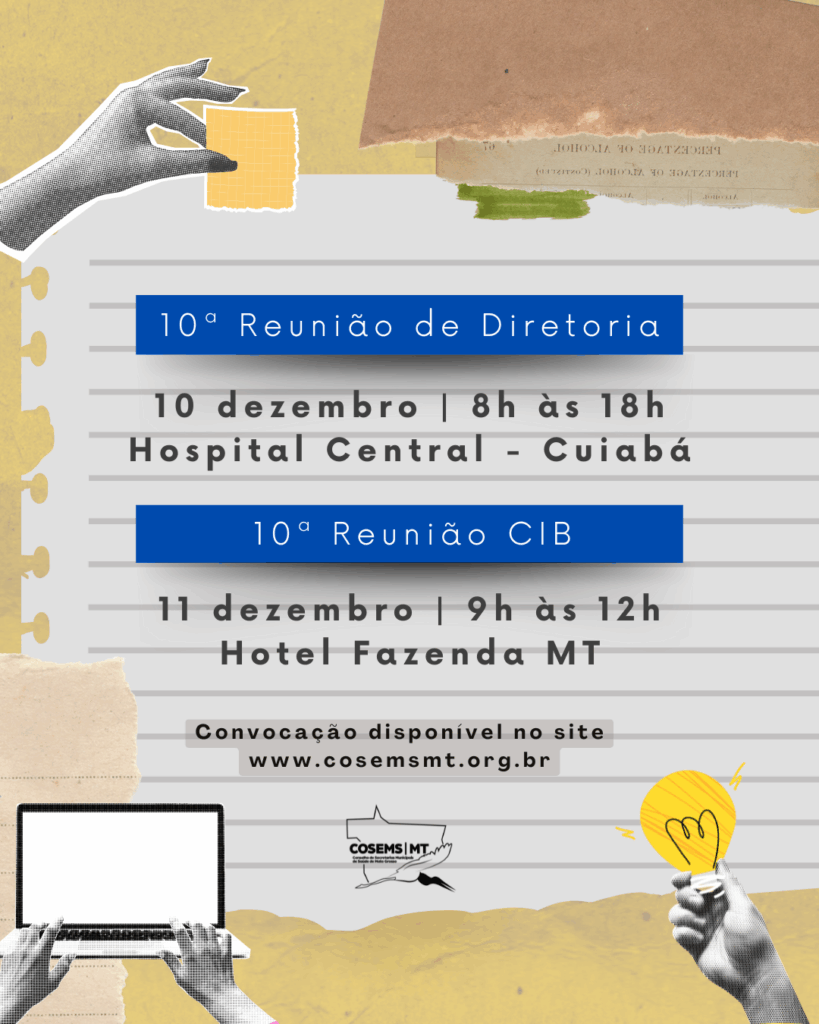 O Presidente do Conselho de Secretarias Municipais de Saúde de Mato Grosso (Cosems/MT) e o Secretário de Saúde de Nova Ubiratã, Marco Antonio Norberto Felipe, CONVOCA os Secretários(as) Municipais de Saúde, eleitos Diretoria Executiva, Conselho Deliberativo/Vice-presidentes Regionais e o Conselho Fiscal para 10ª Reunião de Diretoria a ser realizada no dia 10 de dezembro, das […]