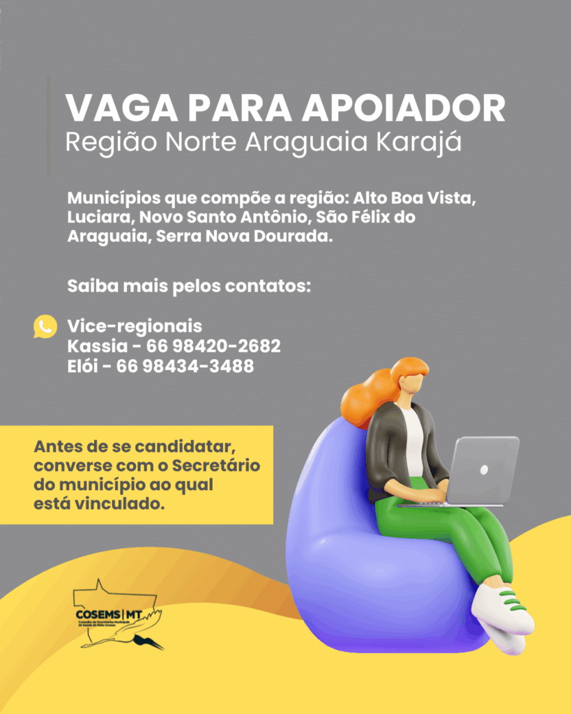 O Conselho de Secretarias Municipais de Saúde do Estado de Mato Grosso (Cosems/MT) divulga informações sobre processo de seleção e publica normas para preenchimento imediato de vaga e formação de cadastro de reserva para a região de saúde Norte Araguaia Karajá relativo a Estratégia Apoiador da Rede Conasems-Cosems. ACESSE O EDITAL AQUI!