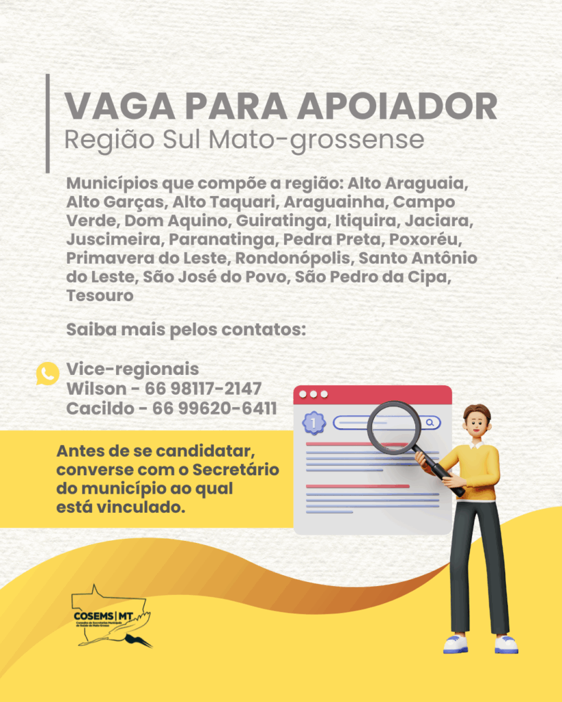 O Conselho de Secretarias Municipais de Saúde do Estado de Mato Grosso (Cosems/MT) divulga informações sobre processo de seleção e publica normas para preenchimento imediato de vaga e formação de cadastro de reserva para a região de saúde Sul Mato-grossense relativo a Estratégia Apoiador da Rede Conasems-Cosems. ACESSE O EDITAL AQUI!