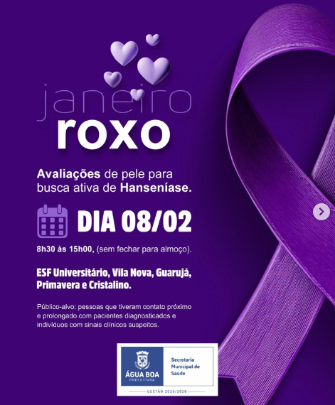 Janeiro Roxo | Hanseníase tem cura! A Secretaria Municipal de Saúde vai realizar Avaliações de Pele para Busca Ativa de Hanseníase, facilitando o acesso para quem trabalha durante a semana. 08 de fevereiro (domingo) – Das 8h30 às 15h (sem fechar para almoço) – ESF Universitário, Vila Nova, Guarujá, Primavera e Cristalino.