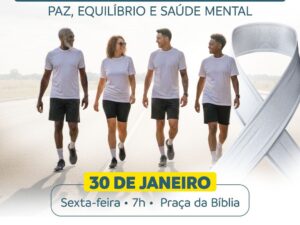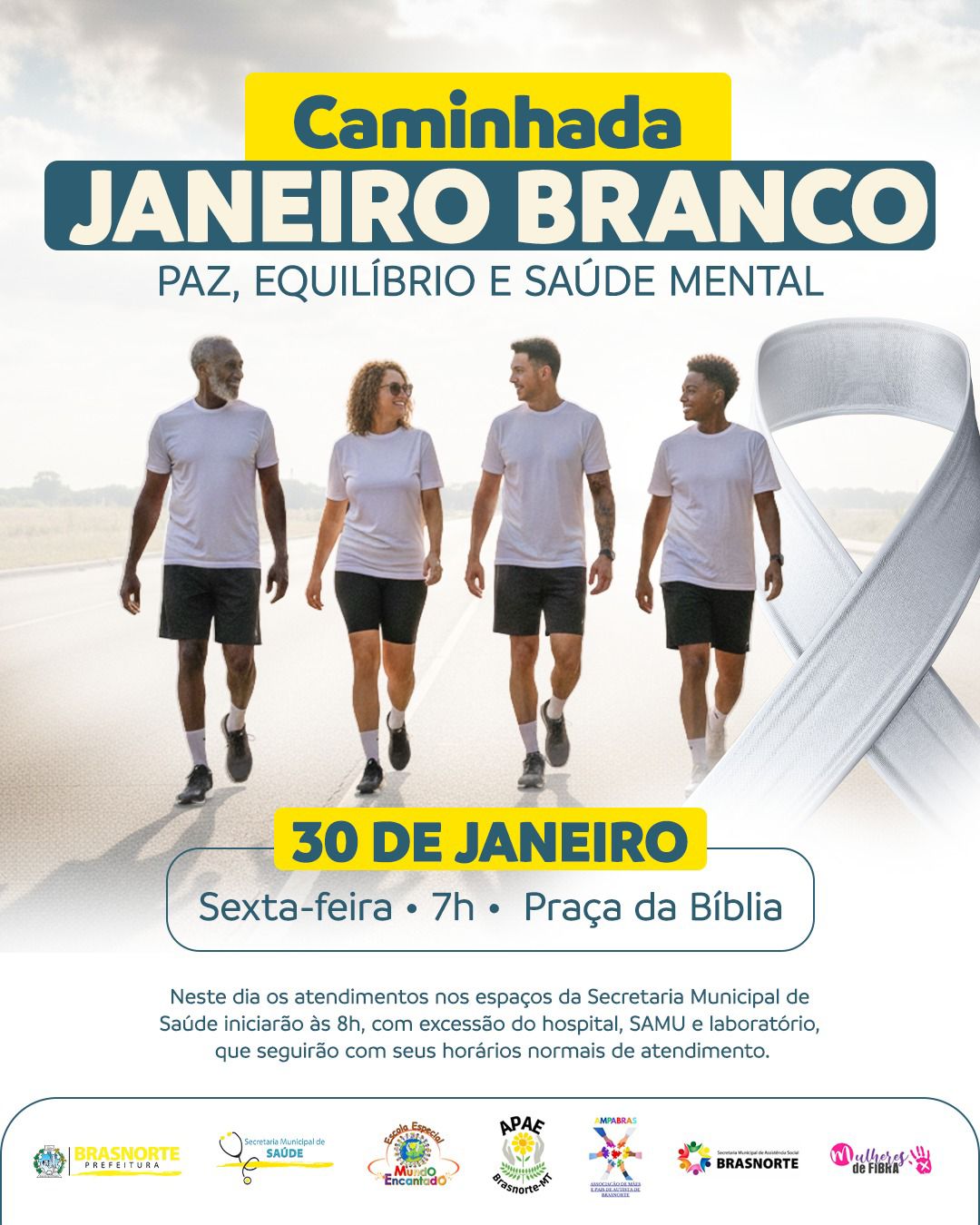 A Secretaria Municipal de Saúde, juntamente com a Secretaria de Assistência Social, Mulheres de Fibra, APAE, AMPABRAS e Hospital Municipal, convidam toda a população para participar da Caminhada Janeiro Branco, um momento de conscientização sobre a importância do cuidado com a saúde mental.