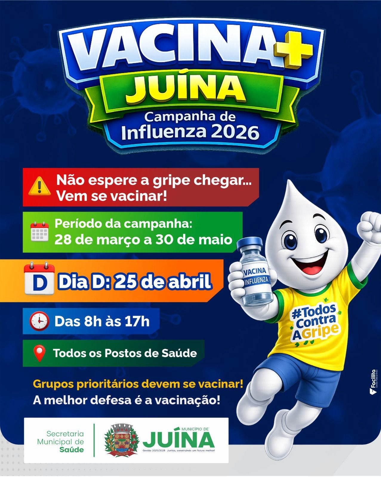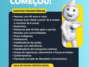 A campanha de vacinação contra a gripe já começou e segue até 30 de maio. Se você faz parte dos grupos prioritários, procure a sua unidade de saúde e vacine-se. Público-alvo: idosos, crianças, gestantes, puérperas, profissionais da saúde e educação, pessoas com comorbidades, entre outros. Procure a UBS mais próxima e leve CPF e cartão de vacinação.