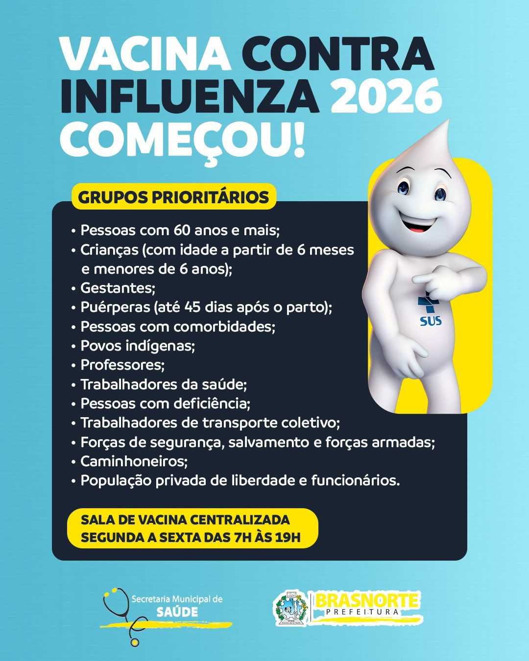 A Secretaria Municipal de Saúde de Brasnorte informa que a campanha de vacinação contra a gripe já está em andamento!