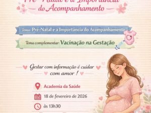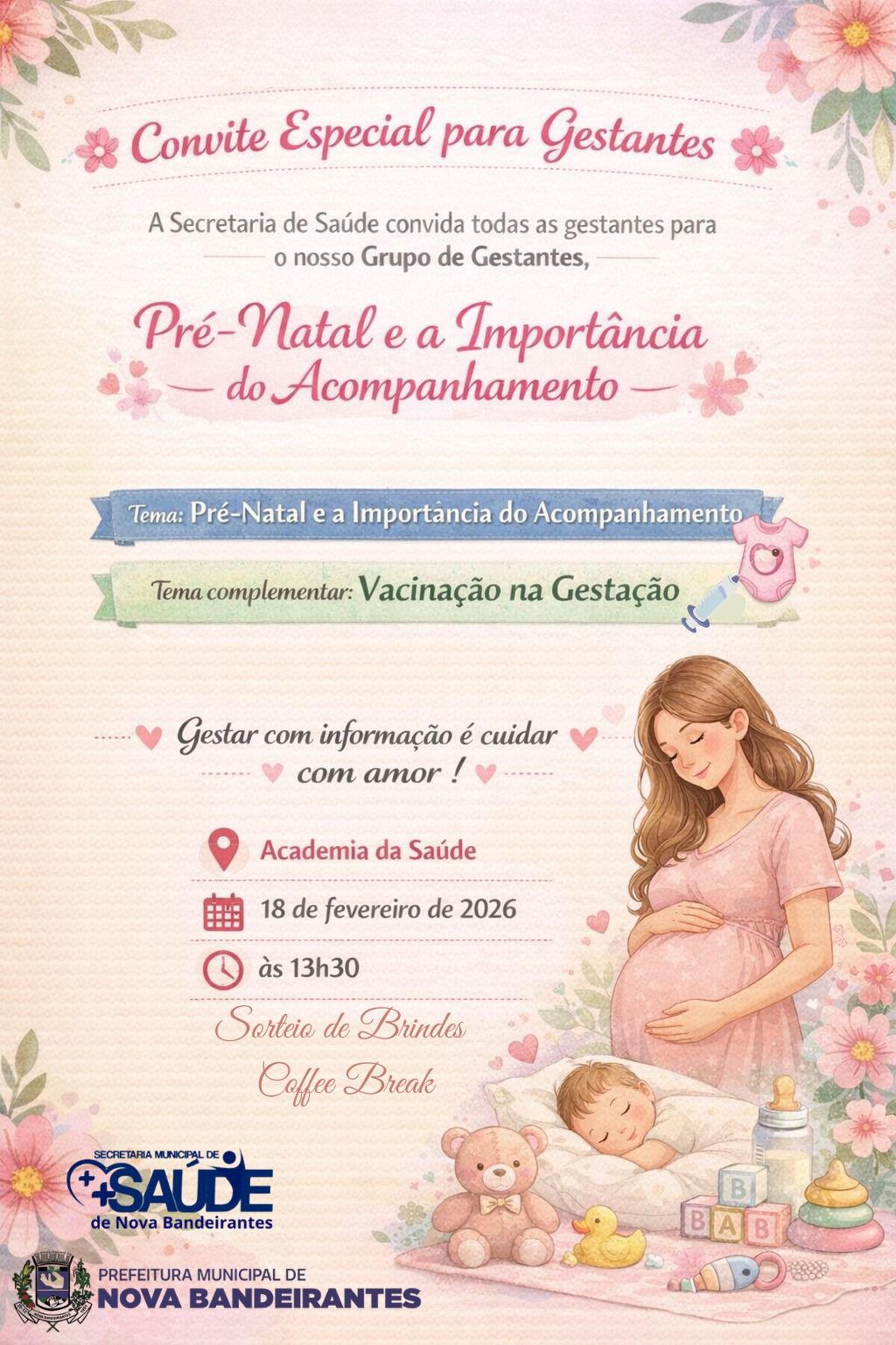 Convite para o primeiro Grupo de Gestantes, um momento de acolhimento, orientação e troca de experiências, fortalecendo o cuidado com a saúde da gestante e do bebê.