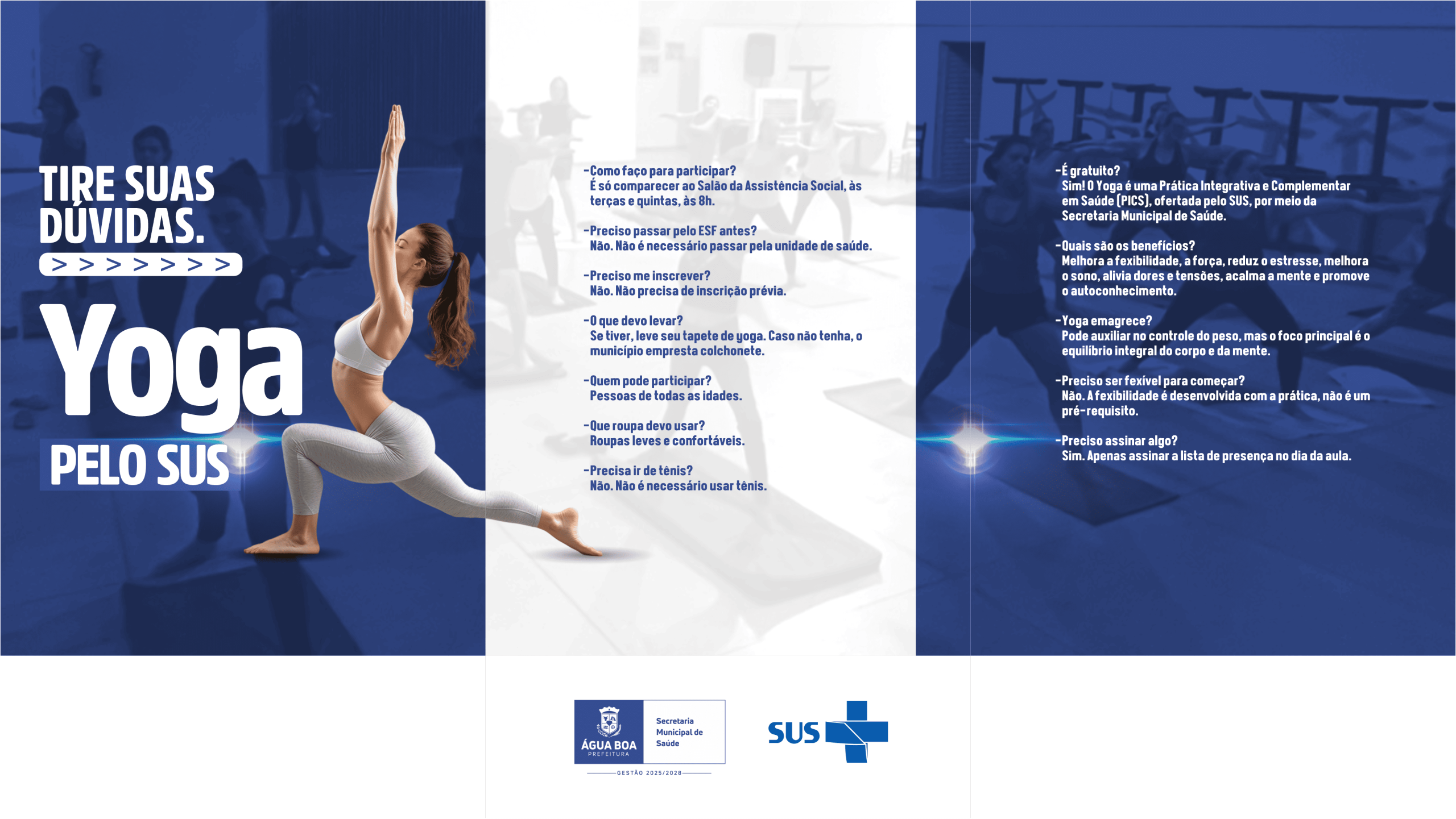 A Prefeitura de Água Boa, por meio da Secretaria Municipal de Saúde, informa que o Yoga pelo SUS está de volta, reafirmando o compromisso com a promoção da saúde, do bem-estar e da qualidade de vida da população. A prática é gratuita, aberta a toda a comunidade e integra as Práticas Integrativas e Complementares em Saúde (PICS) ofertadas pelo Sistema Único de Saúde.