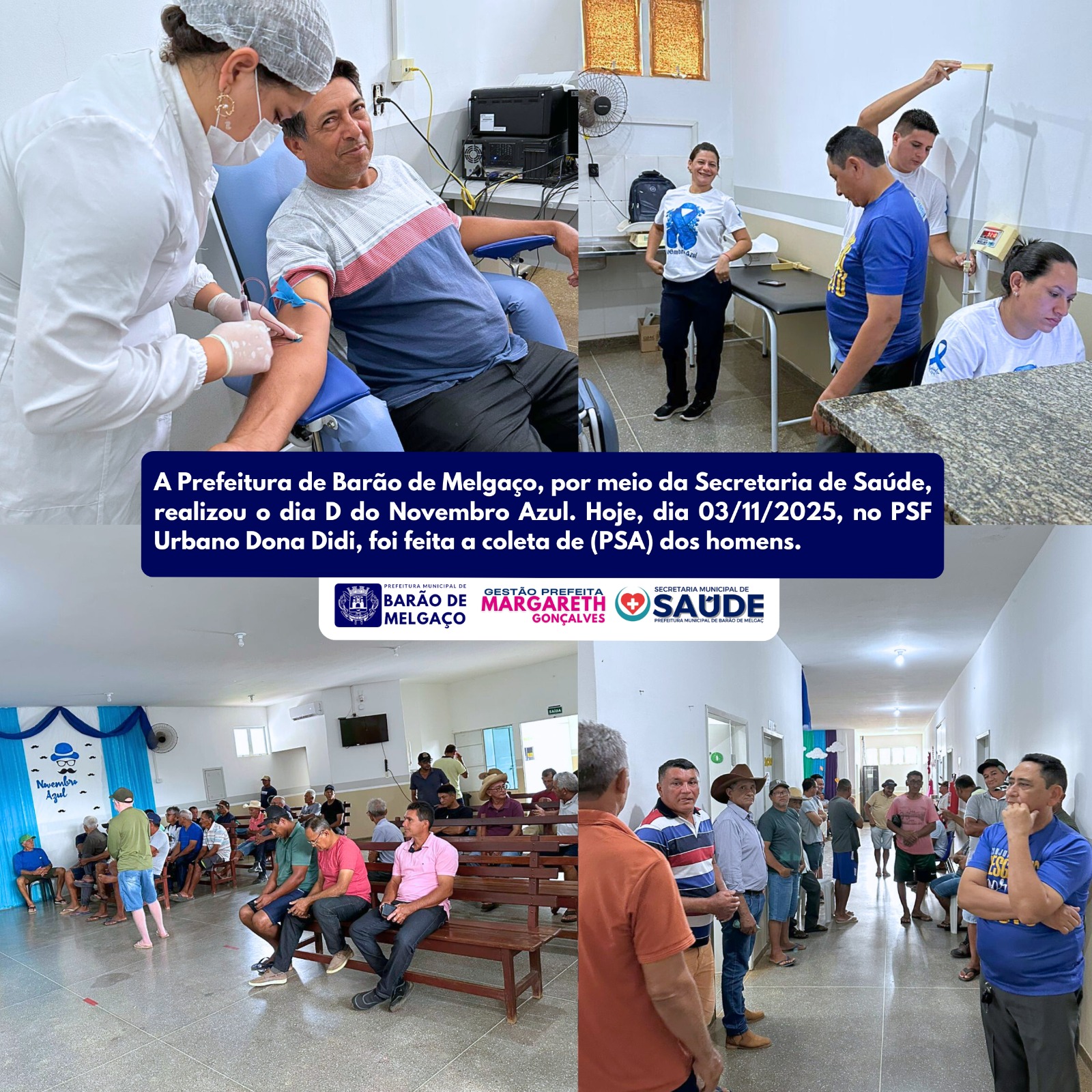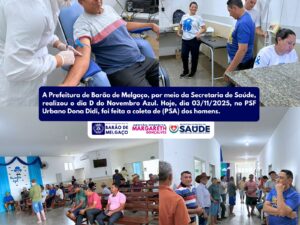 Novembro Azul – Cuidar também é coisa de homem! A prevenção é o melhor caminho para uma vida longa e saudável. O exame de próstata é feito por meio de uma simples coleta de sangue — rápido, fácil e que pode salvar vidas. Não deixe o preconceito ser mais forte que o cuidado com a sua saúde. Procure a unidade de saúde, realize seus exames preventivos e concorra a diversos brindes!
