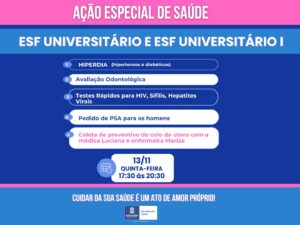 Pensando em oferecer mais oportunidades de cuidado à população que trabalha durante o dia, as equipes das ESFs Universitário e Universitário 1 realizam nesta quinta-feira, 13 de novembro, uma ação especial de saúde voltada para homens, mulheres, diabéticos e hipertensos. O atendimento será em horário estendido, das 17h30 às 20h30, facilitando o acesso aos serviços e incentivando a prevenção e o acompanhamento da saúde.