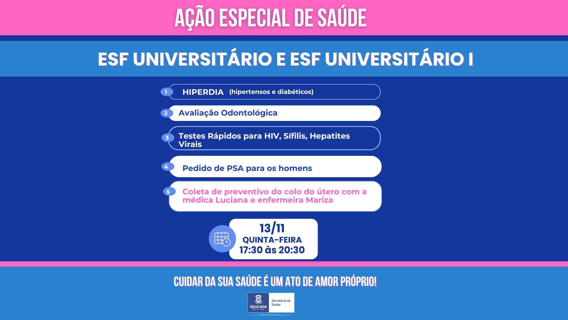 A Prefeitura de Água Boa, por meio da Secretaria Municipal de Saúde, convida toda a população para participar das ações especiais de saúde que serão realizadas em horários diferenciados, garantindo que mais pessoas possam aproveitar os atendimentos. As ações acontecerão neste sábado, 15 de novembro e na quarta-feira (26)  nas ESFs Vila Nova, Universitário e Central.
