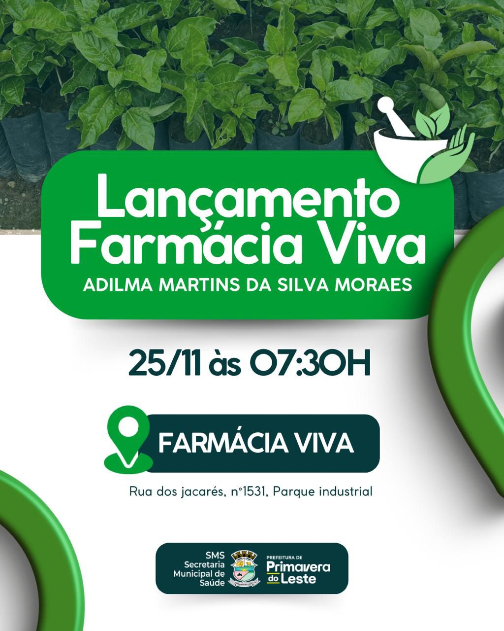 Vem aí o lançamento da Farmácia Viva! Dia 25 de novembro, às 19h30 — A Secretaria Municipal de Saúde está implantando a Farmácia Viva, um projeto que une saber popular e ciência para oferecer plantas medicinais e fitoterápicos de forma segura e gratuita pelo SUS.