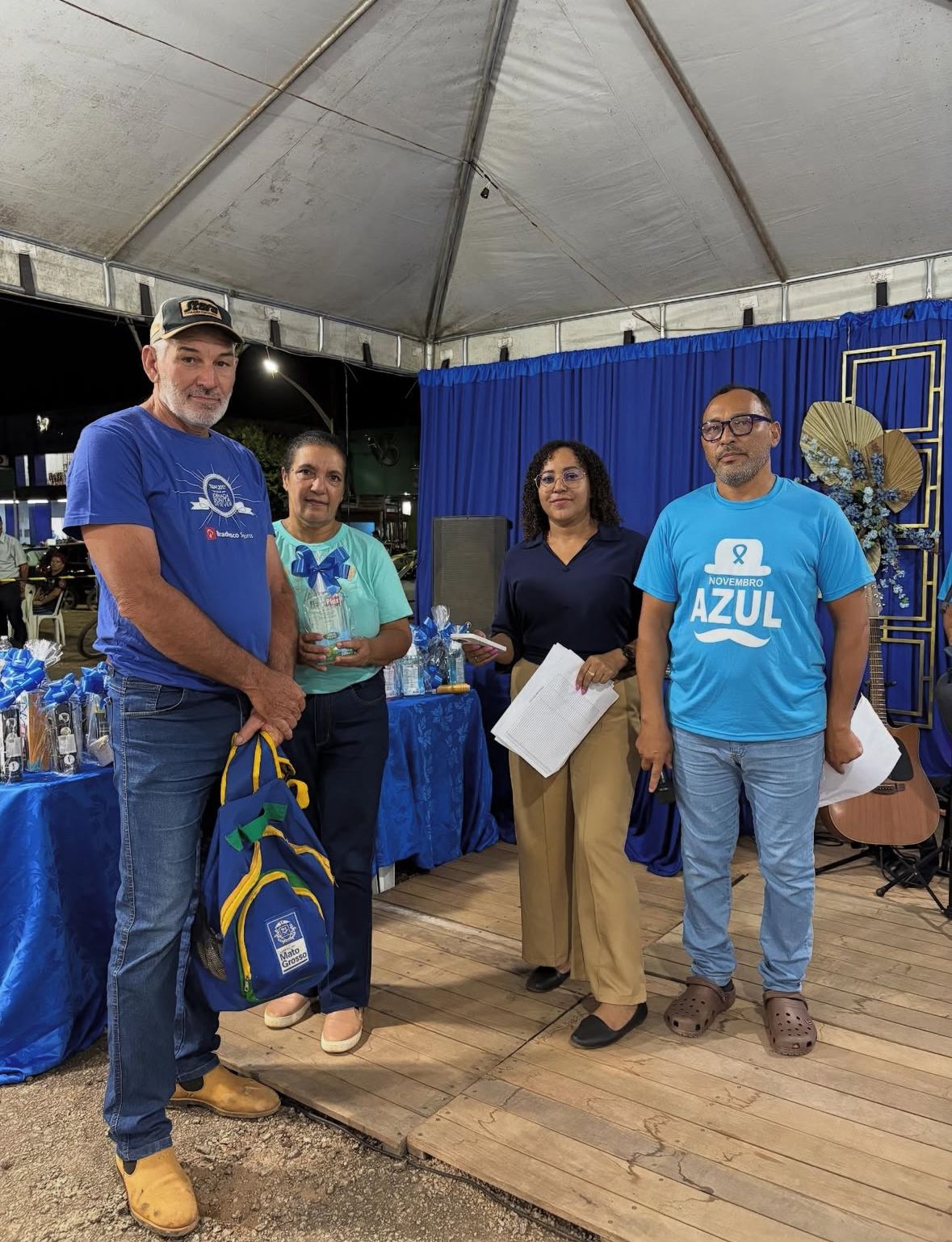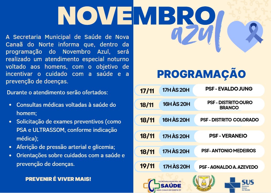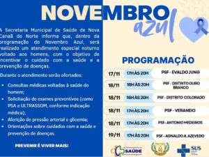 No dia 14/11, Nova Bandeirantes celebrou o Dia D do Novembro Azul, com muita música sertaneja e diversas ações de cuidado com a saúde: aferição de pressão arterial, glicemia capilar, consulta médica, coleta de PSA, testes rápidos (HIV, sífilis, hepatite B e C), vacinação, teste rápido de malária e Chagas, avaliação com bioimpedância, corte de cabelo e orientações sobre prevenção e tratamento do tabagismo. A ação ocorreu das 16h às 21h e contou com uma roda de conversa sobre saúde do homem, com a participação de profissionais e convidados que abordaram temas como saúde mental, atividade física, gestão de pessoas e finanças.