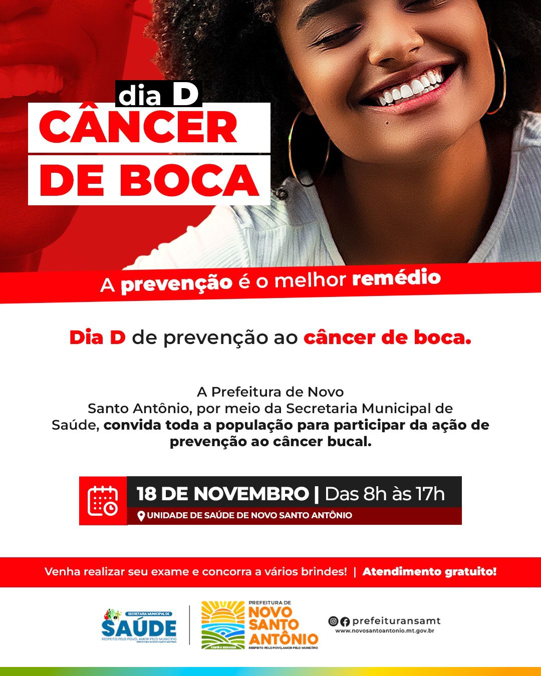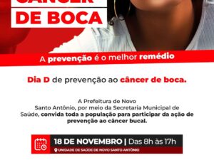 A Prefeitura de Novo Santo Antônio, por meio da Secretaria Municipal de Saúde, convida toda a população para participar da ação de prevenção ao câncer bucal. Serão realizados exames, orientações e entregue vários brindes!