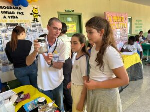 Saúde participando da Mostra Pedagógica na escola municipal Daniel Titon, com Verificação de PA e glicemia. Orientação sobre prevenção à dengue por meio de jogos educativos e exposição de larvas coletadas.