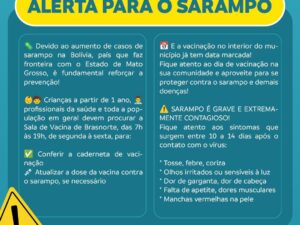 Devido ao aumento de casos de sarampo na Bolívia, país que faz fronteira com o Estado de Mato Grosso, é fundamental reforçar a prevenção! Crianças a partir de 1 ano, profissionais da saúde e toda a população em geral devem procurar a Sala de Vacina de Brasnorte, das 7h às 19h, de segunda à sexta, para: Conferir a caderneta de vacinação e atualizar a dose da vacina contra o sarampo, se necessário.