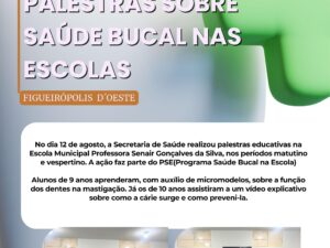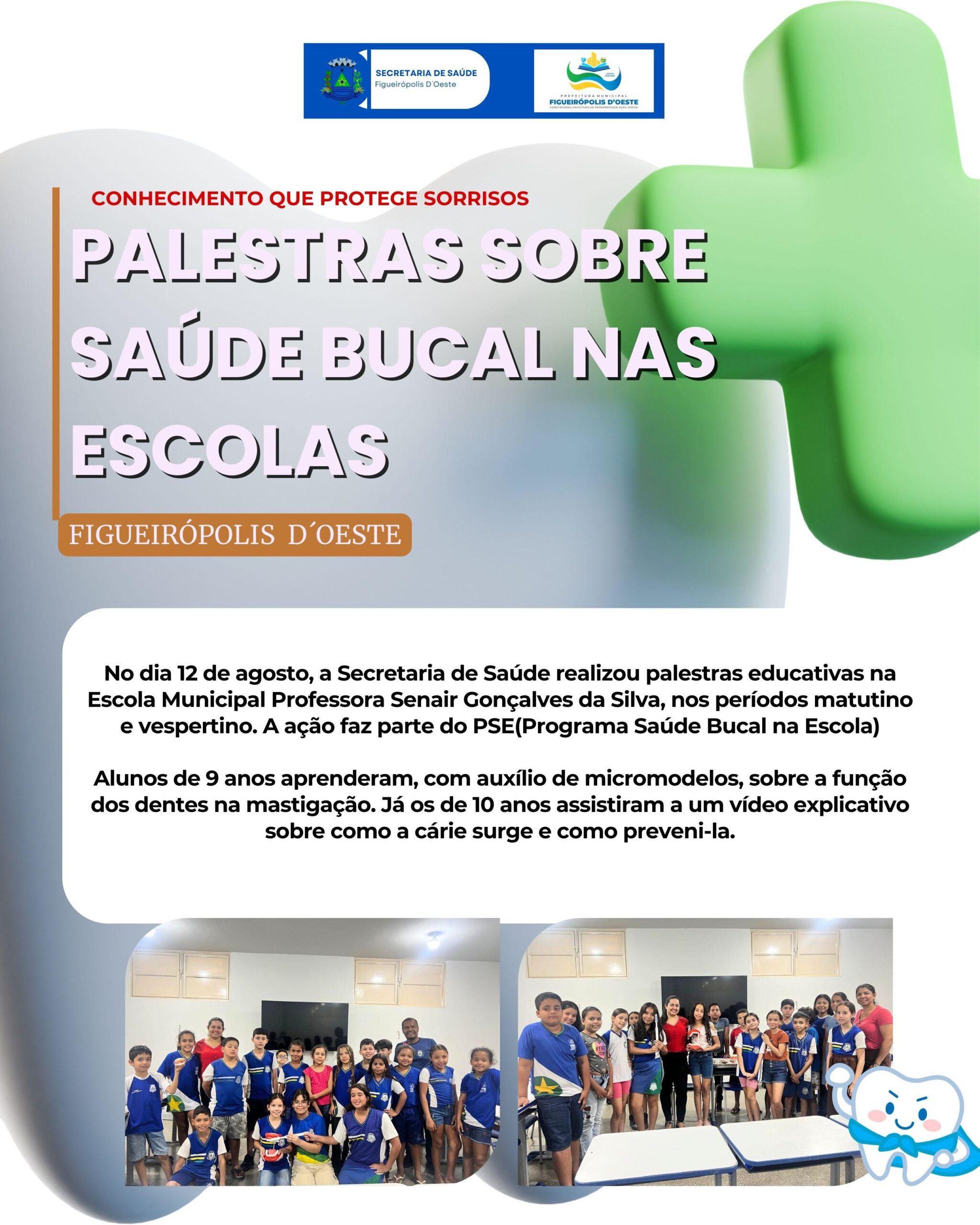 A Secretaria Municipal de Saúde de Figueirópolis D’Oeste realizou, no dia 12/08, uma ação de educação em saúde bucal na Escola Municipal Professora Senair Gonçalves da Silva. A ação faz parte do PSE (Programa Saúde Bucal na Escola). A atividade foi conduzida pela cirurgiã-dentista Glória Estefhane da Silva Seidht e sua auxiliar em saúde bucal Andréia Rocha de Freitas, nos períodos matutino e vespertino.