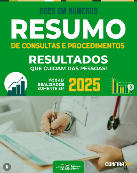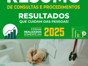 Resumo de 2025. Um ano de muito trabalho, cuidado e compromisso com a saúde da população. Foram milhares de consultas e procedimentos realizados, levando mais atendimento, mais acesso e mais qualidade de vida para todos.