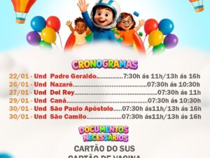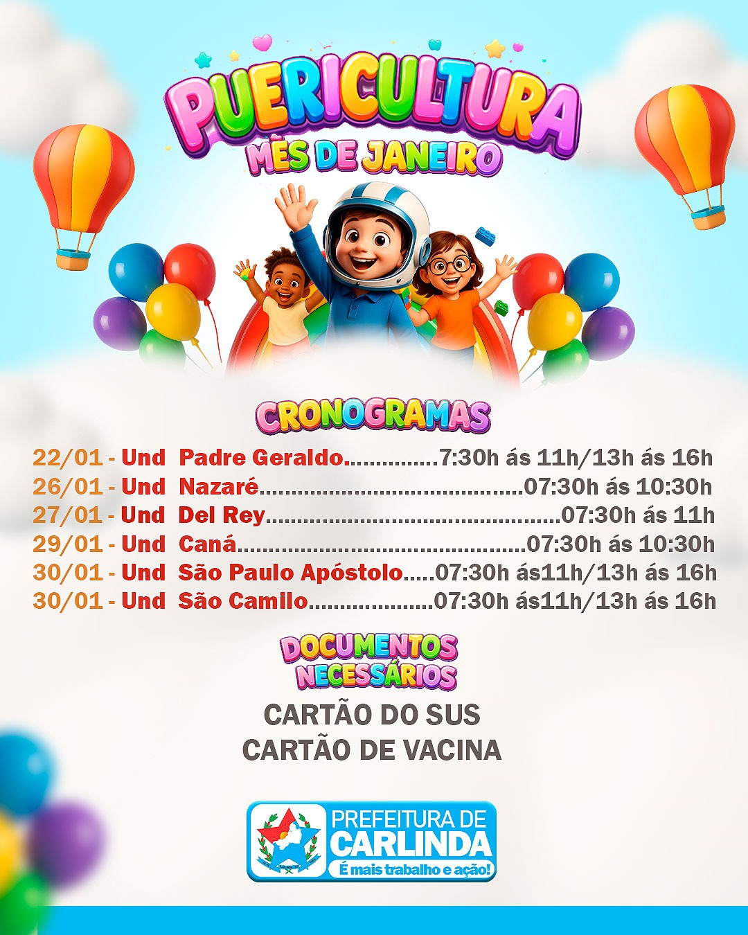 Confira o cronograma de atendimentos de Puericultura nas unidades de saúde durante o mês de janeiro e leve seu pequeno para acompanhamento completo, com carinho e atenção.
