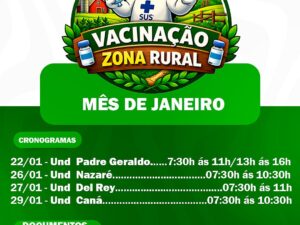 A Prefeitura municipal de Carlinda, por meio da secretaria Saúde, segue cuidando de quem vive e trabalha no campo. A vacinação está chegando às comunidades rurais. Fique atento ao cronograma e não deixe de se vacinar!