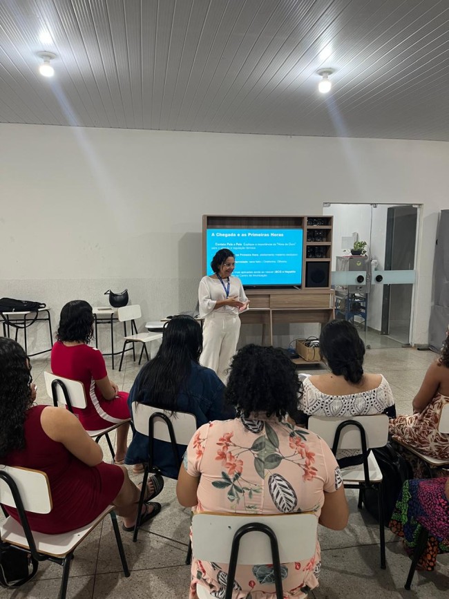 Durante a palestra, foram abordados temas fundamentais relacionados à chegada do recém-nascido e às primeiras horas após o nascimento, com destaque para a importância do contato pele a pele, da amamentação na primeira hora de vida, da realização dos exames ainda na maternidade e da aplicação das vacinas recomendadas ao nascer, como BCG e Hepatite B.