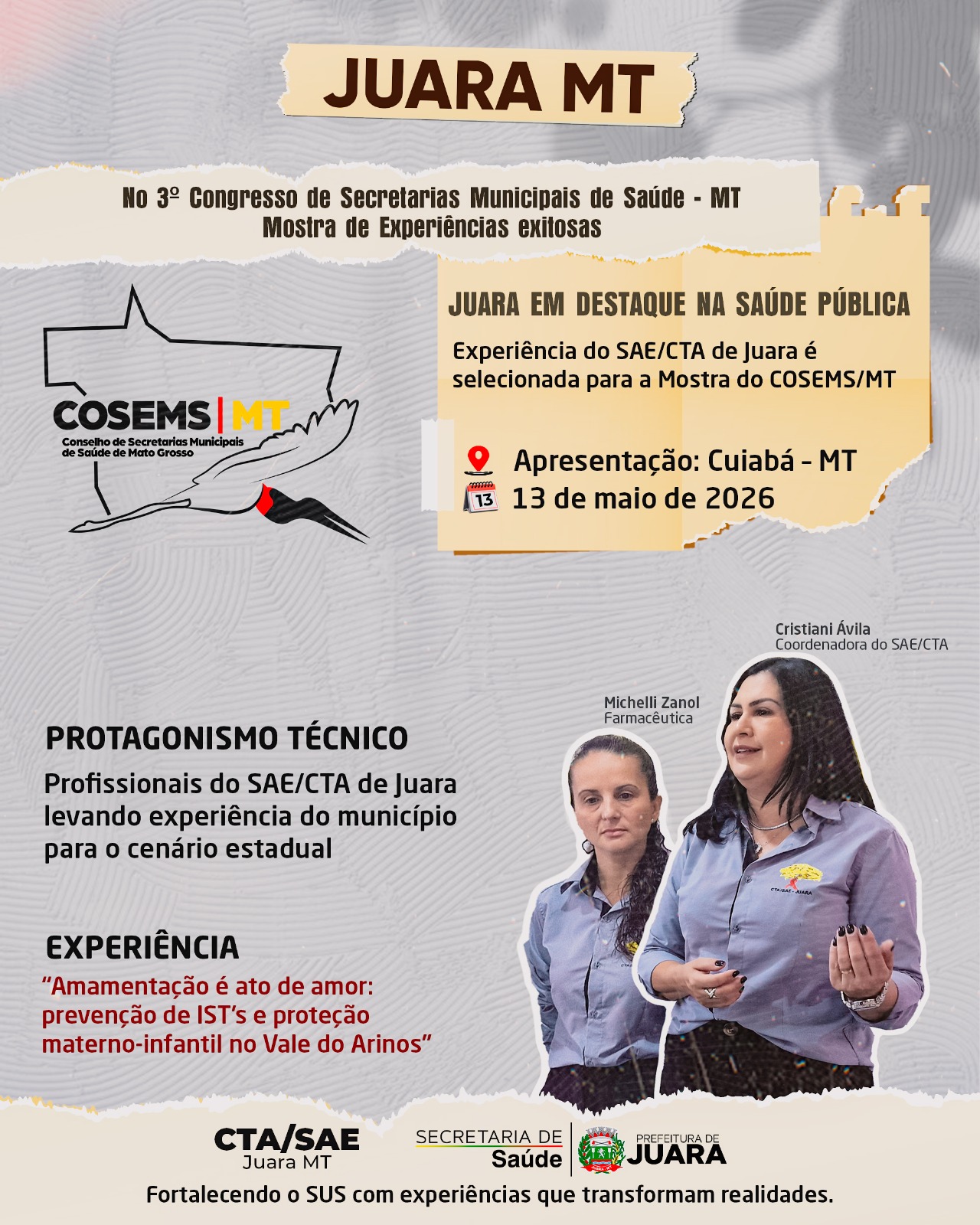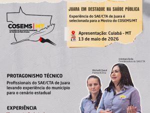 A iniciativa, construída no âmbito do SAE/CTA de Juara e aplicada em municípios do Vale do Arinos, foi selecionada para apresentação no 3º Congresso de Secretarias Municipais de Saúde de Mato Grosso, que será realizado entre os dias 13 e 15 de maio de 2026, em Cuiabá.