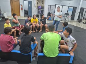 Encontro do grupo de gestantes com a nutricionista Isabela, abordando a importância da nutrição durante a gestação, com orientações para uma alimentação saudável e adequada nesse período.