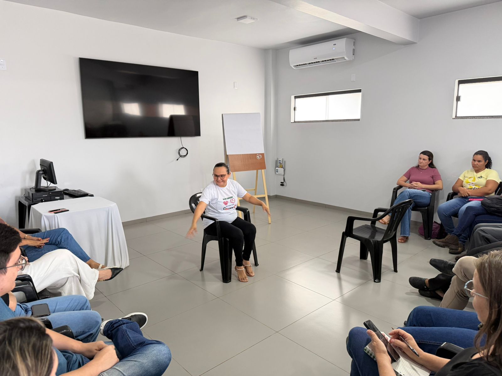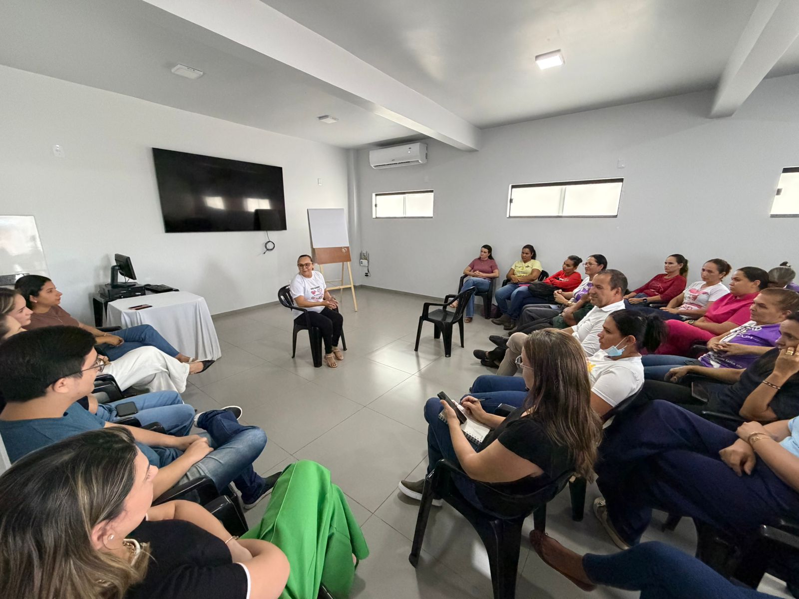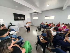 Reunião de capacitação com recepcionistas da Atenção Básica, abordando atendimento humanizado, comunicação, fluxograma interno e uso do sistema de informação, com foco na melhoria do acolhimento e organização dos serviços.