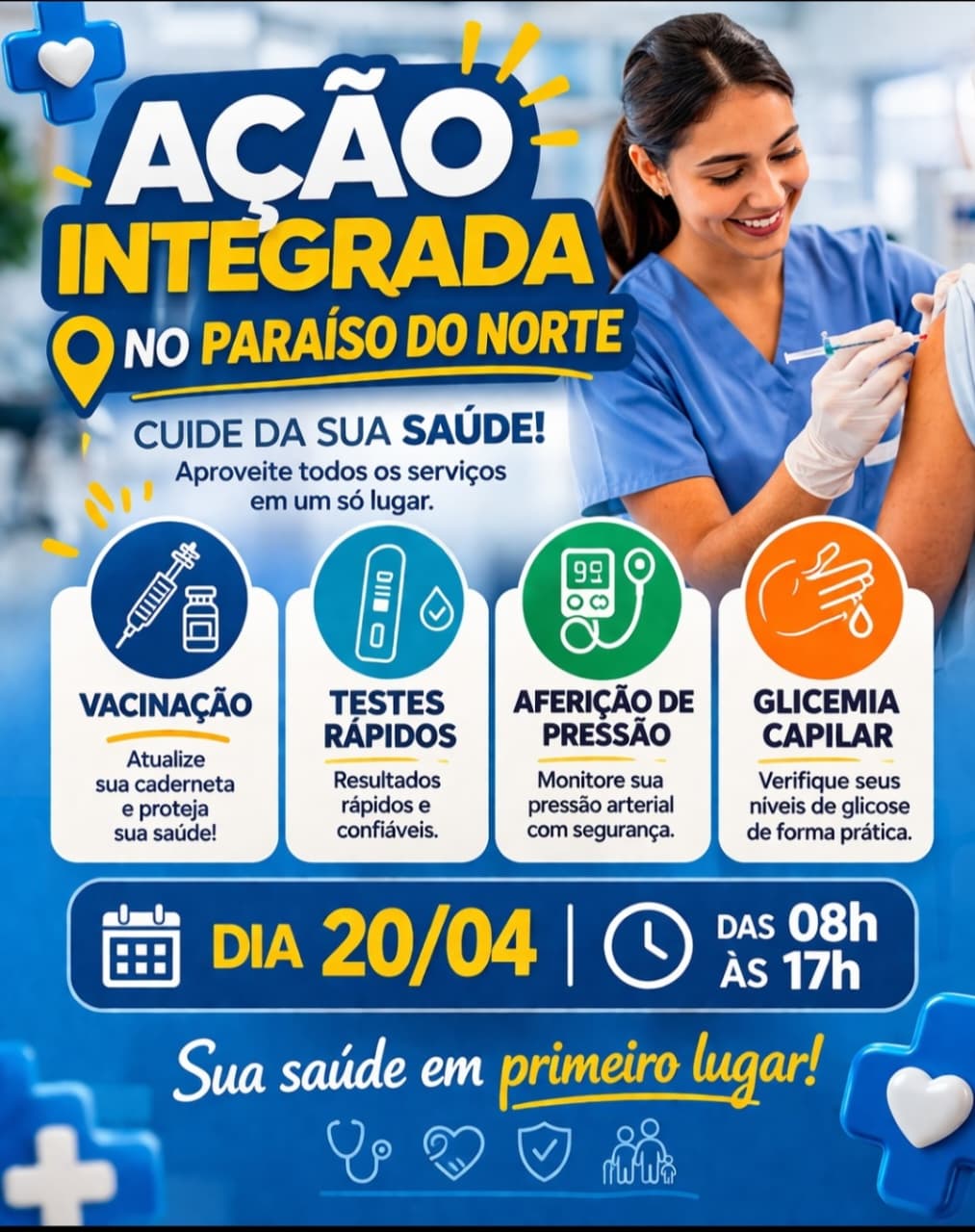 A Secretaria de Saúde estará presente na Ação Integrada promovida pela Secretaria de Indústria e Comércio no Assentamento, levando atendimentos e orientações à população, reforçando o cuidado e a promoção da saúde no território.