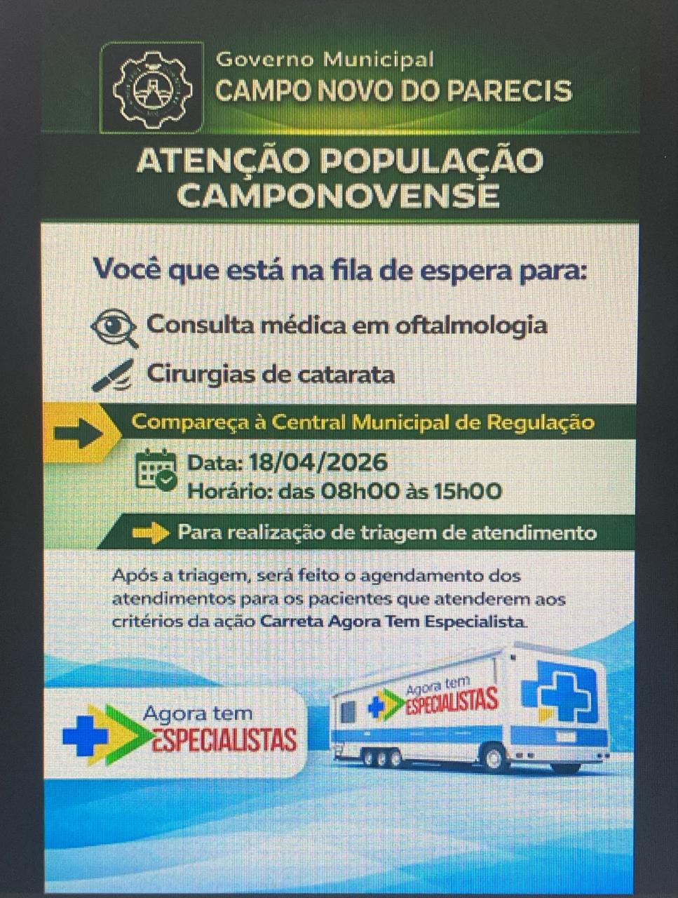 O município de Campo Novo do Parecis faz parte de um importante projeto do Ministério da Saúde, em parceria com a Secretaria de Estado, por meio da Unidade Móvel – Carreta do Programa Agora Tem Especialista, que está instalada na regional de Tangará da Serra-MT.