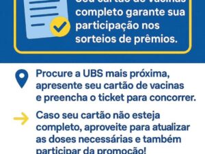 Quem apresentar o cartão de vacinas completo em sua UBS de referência poderá preencher um cupom para concorrer a prêmios incríveis! Prêmios: