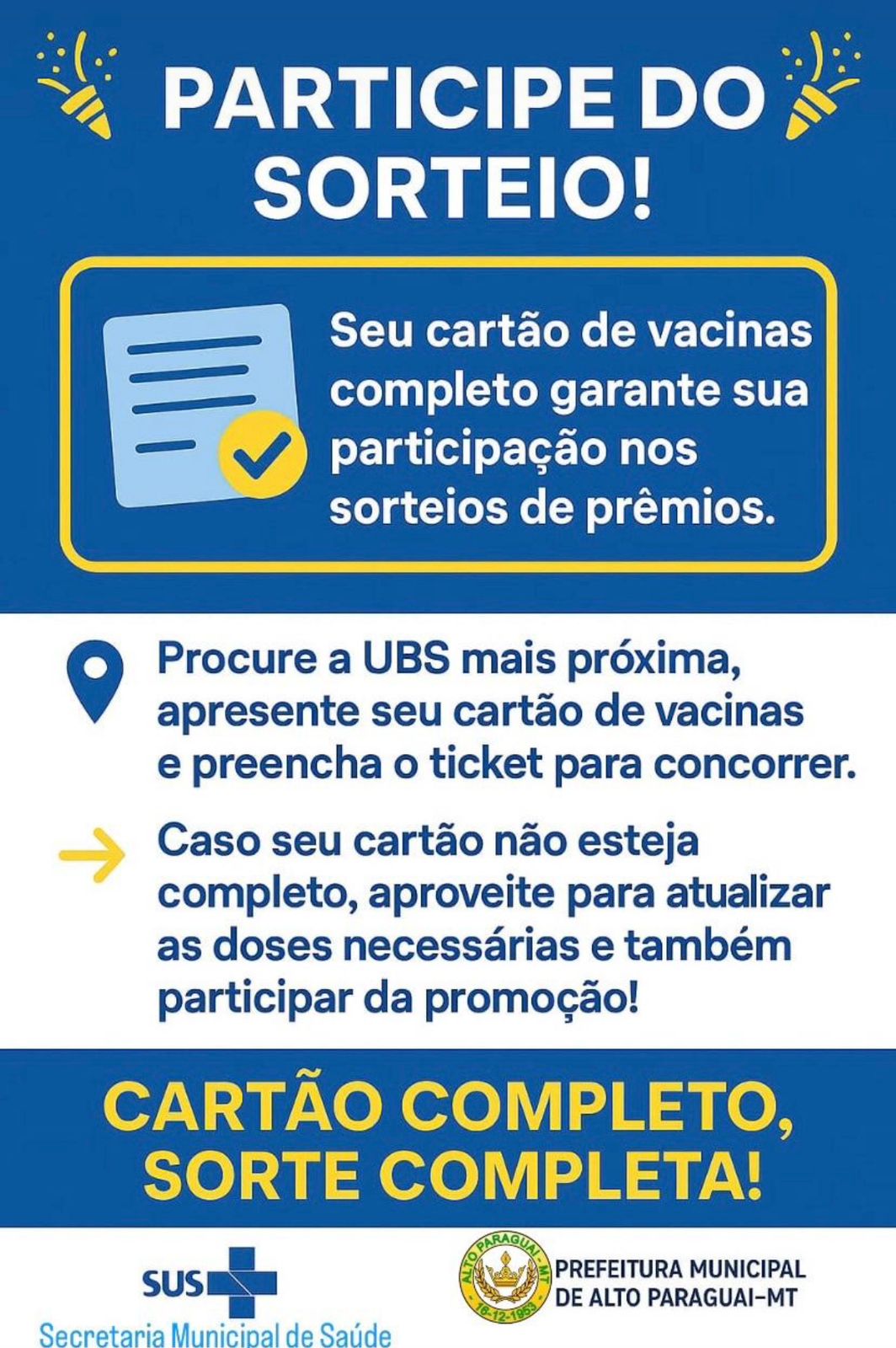 Ação de incentivo à vacinação no município. O Município de Alto Paraguai convida toda a população a manter a caderneta de vacinação em dia.