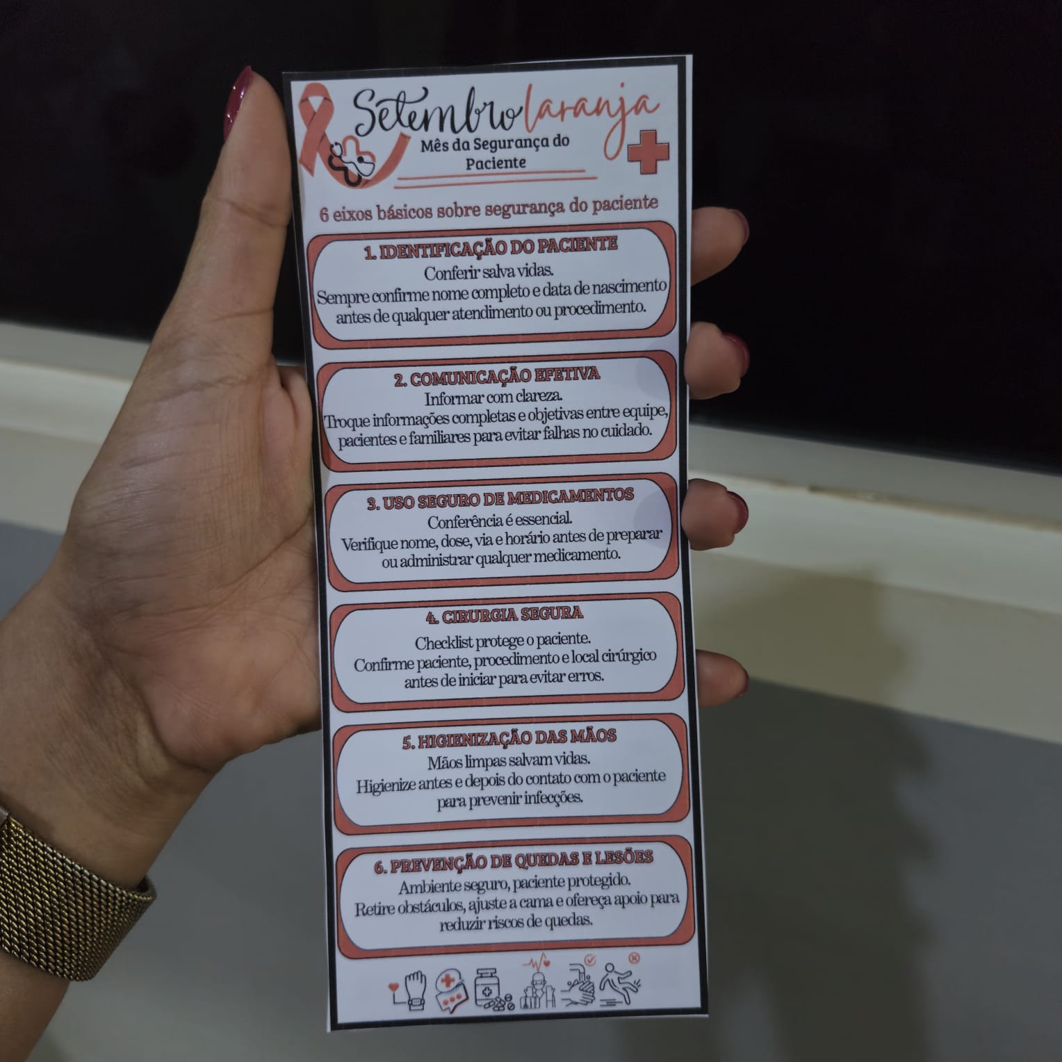 No último dia 17 de setembro, celebramos o Dia Mundial da Segurança do Paciente. Teve ação alusiva à data, reunindo a equipe para reforçar a importância de cuidar, prevenir e acolher. Durante o encontro, compartilhou-se mensagens sobre momentos marcantes e se relembrou que cada atitude faz a diferença para manter os pacientes seguros.