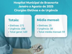 Hospital Municipal de Brasnorte de Janeiro a Agosto de 2025 – 8 meses de Cirurgias Eletivas e de Urgência! Eletivas: 171, Urgência: 298 = Total geral: 469.