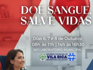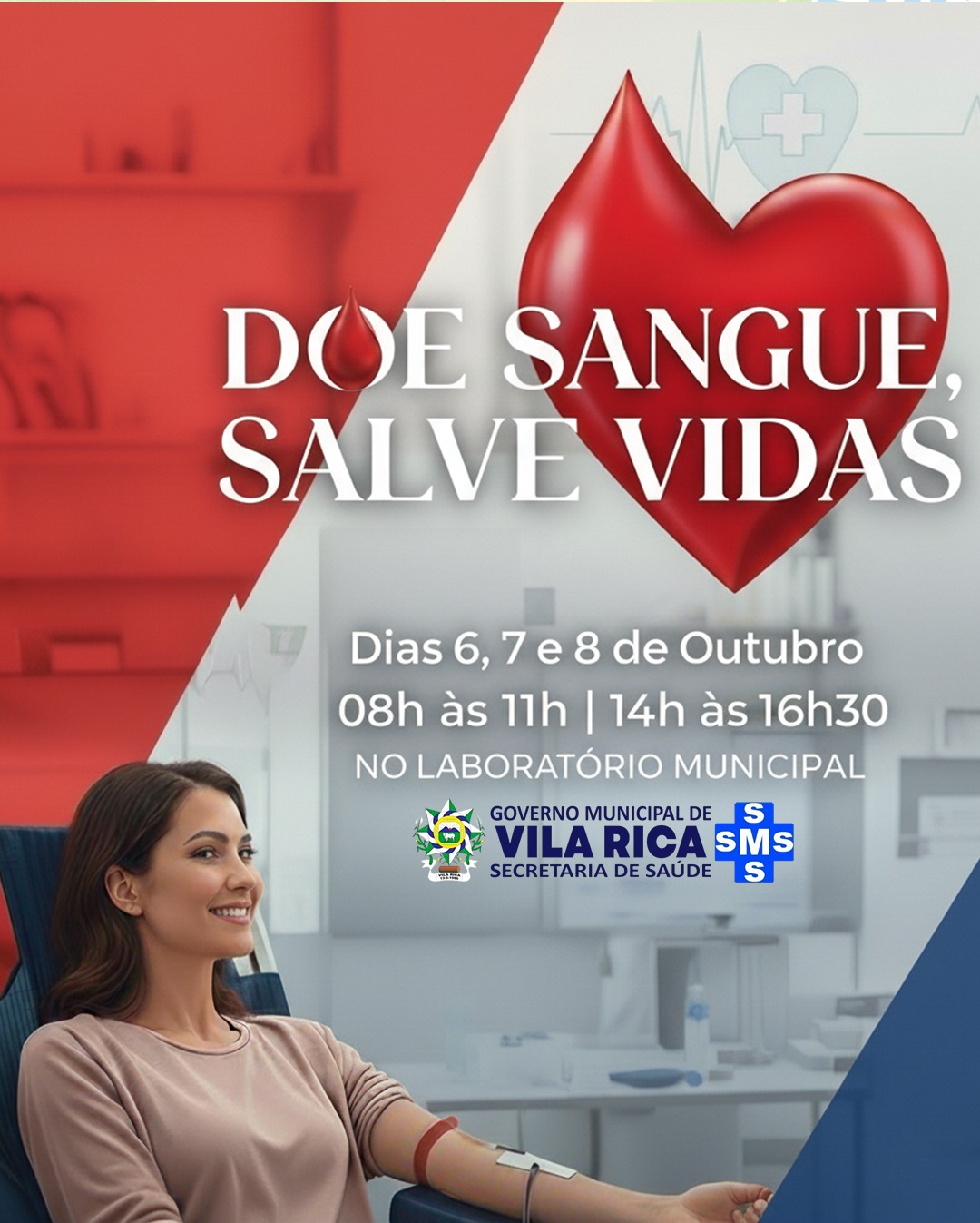 O Laboratório Municipal realizará a campanha de doação de sangue e sua participação é fundamental. Uma única doação pode ajudar até 4 pessoas! Quando? Dias 6, 7 e 8 de Outubro, Horários? Manhã: 08:00 às 11:00 e Tarde: 14:00 às 16:30 no Laboratório Municipal.