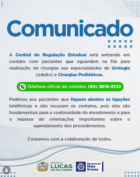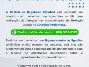 A Central de Regulação Estadual está entrando em contato com pacientes que aguardam cirurgias de Urologia (adulto) e Cirurgias Pediátricas.