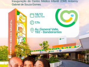 O Prefeito Municipal de Cuiabá, e a Secretária Municipal de Saúde, Danielle Carmona, convidam para a Solenidade de Inauguração do Centro Médico Infantil – CMI Antonny Gabriel de Souza Gomes. Dia: 18 de dezembro 2025 (quinta-feira), às 17h, Avenida General Valle, 192 – Bairro Bandeirantes.