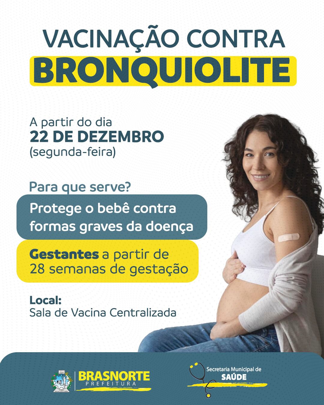 A Secretaria Municipal de Saúde de Brasnorte informa que, a partir do dia 22 de dezembro (segunda-feira), terá início a vacinação contra a bronquiolite.