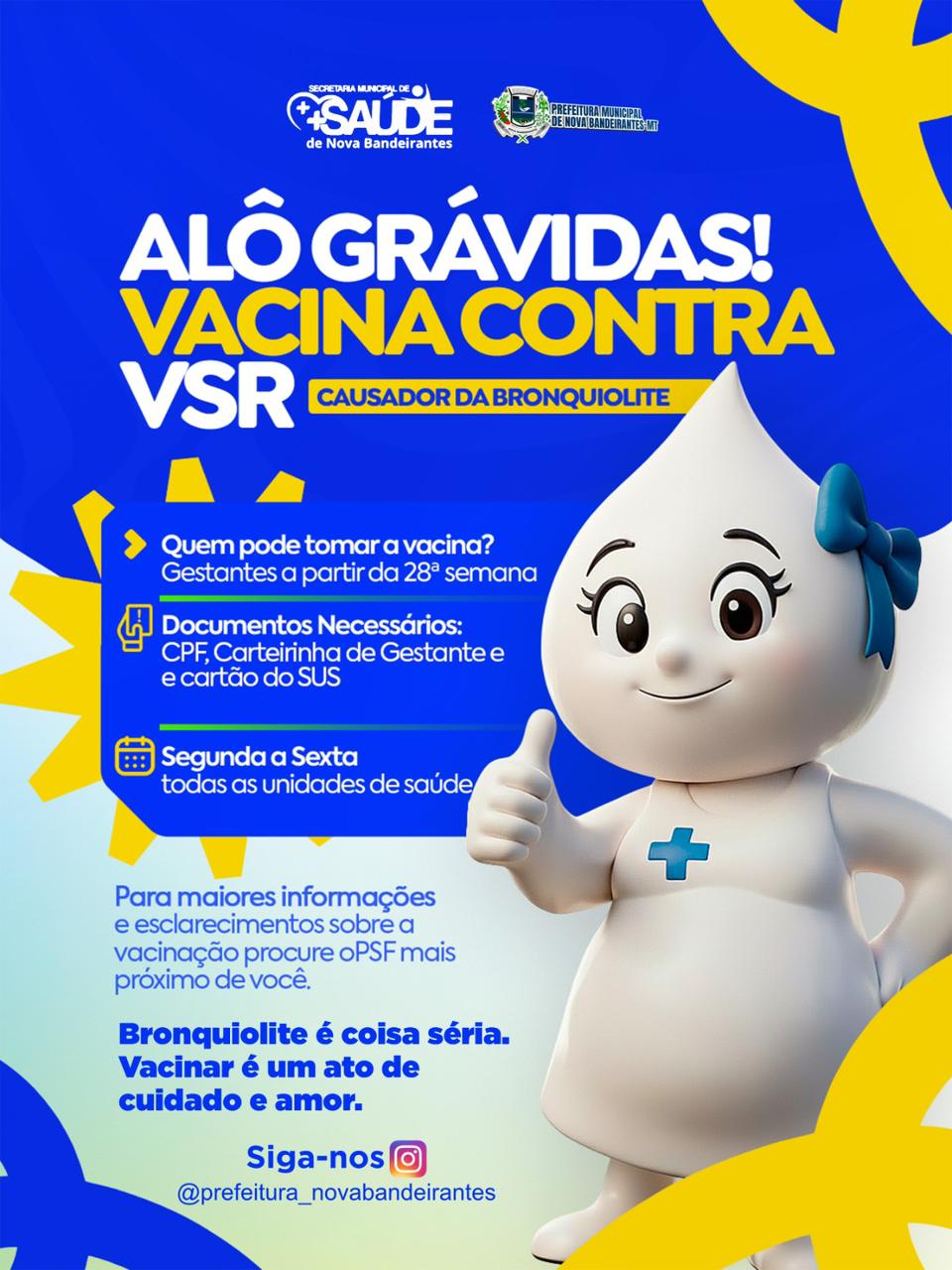 As salas de vacina de Nova Bandeirantes já iniciaram a vacinação contra o VSR, destinada a gestantes a partir de 28 semanas de gestação, com o objetivo de proteger a mãe e o bebê contra a bronquiolite e outras infecções respiratórias.