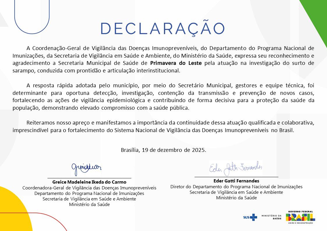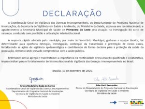 Em reconhecimento à resposta dada ao surto de sarampo e colaboração para o Brasil se manter país livre da circulação endêmica do vírus, o município recebeu uma declaração de agradecimento pela atuação da Greice Madeleine, CGVDI/DPNI/SVSA/MS.