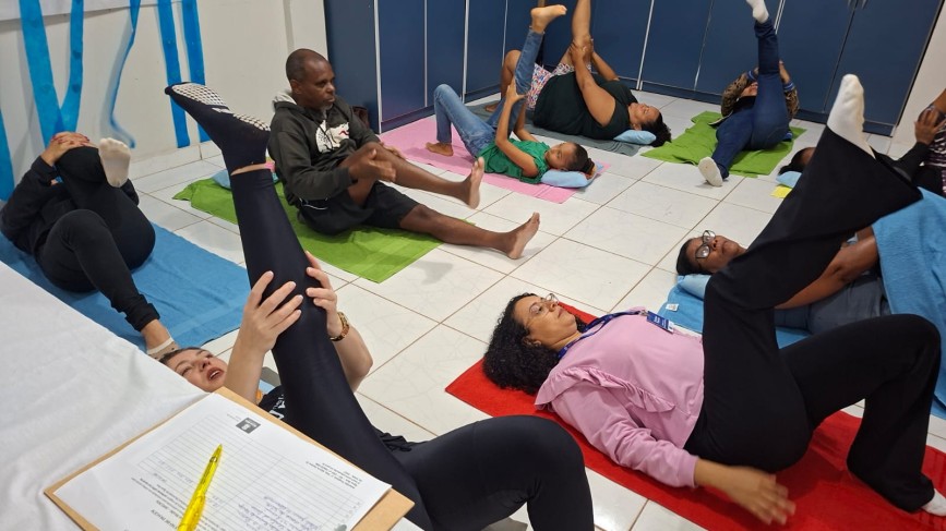 Durante o encontro, foram realizadas práticas de respiração consciente, alongamentos leves, exercícios de mobilidade e técnicas simples de relaxamento, sempre respeitando os limites individuais de cada participante.