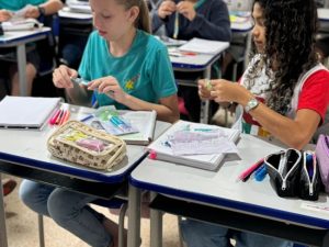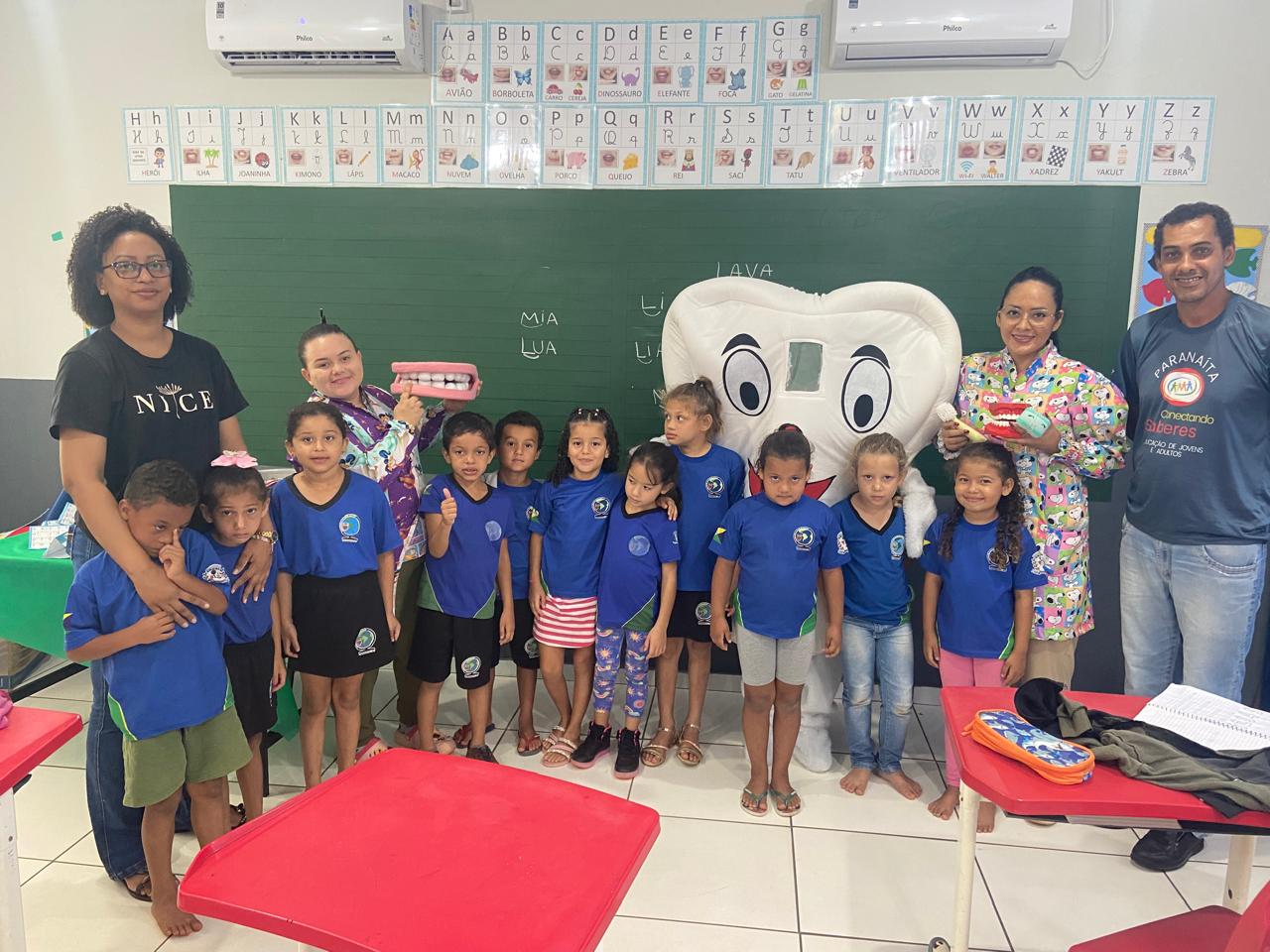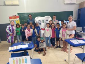 A equipe de saúde bucal realizou ação na escola, em parceria com o Léo Clube, promovendo orientações sobre higiene oral, escovação supervisionada e entrega de kits de higiene, fortalecendo a prevenção e os cuidados com a saúde bucal dos alunos.