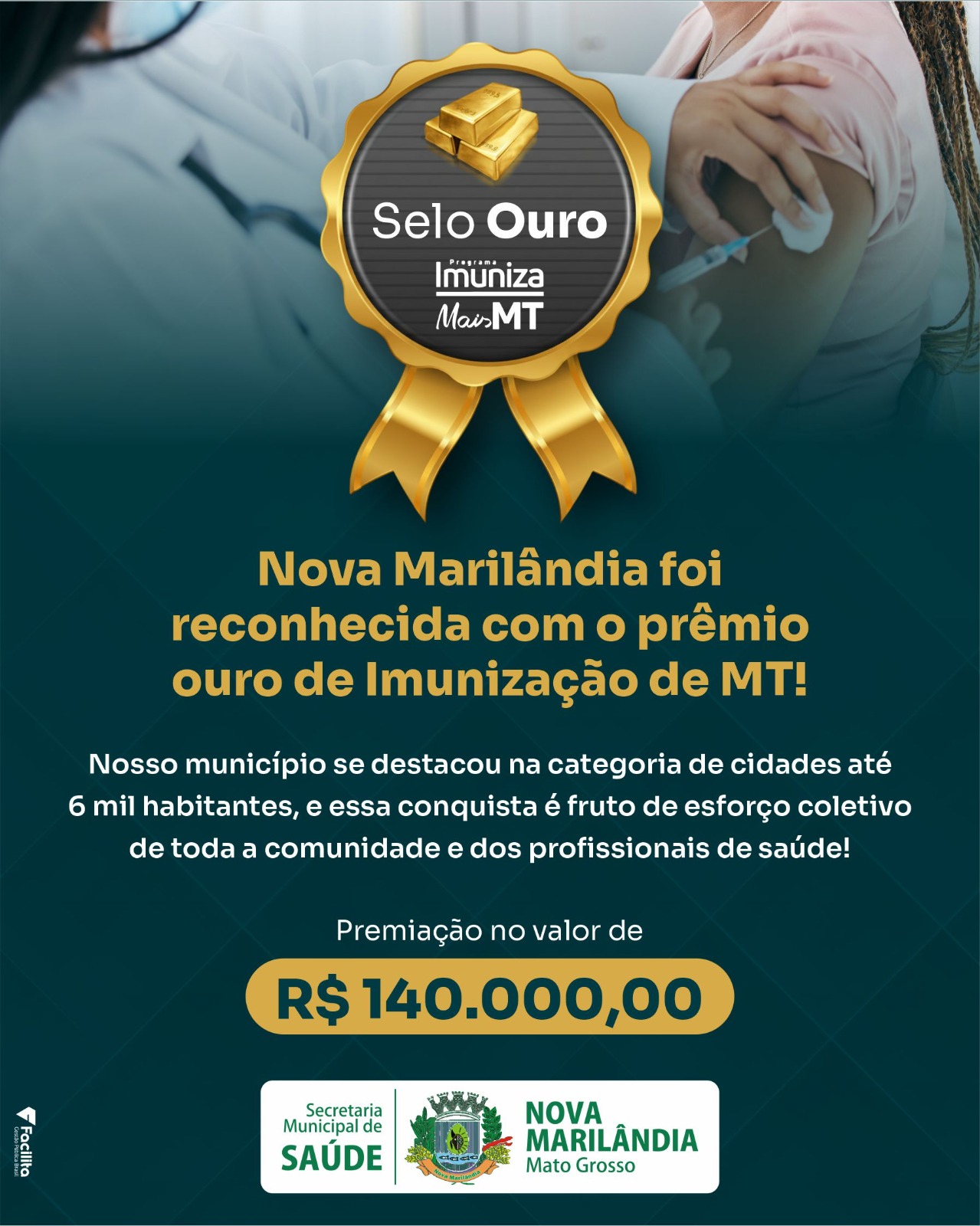 Nova Marilândia conquista o Selo Ouro em Imunização. É com grande orgulho que anunciamos que Nova Marilândia foi reconhecida com o Prêmio Ouro de Imunização do Programa Imuniza Mais MT, na categoria de municípios com até 6 mil habitantes. Essa importante conquista é resultado do trabalho sério, do comprometimento e do esforço coletivo de toda a equipe de saúde, gestores e, principalmente, da população, que acreditou e participou ativamente das ações de vacinação.
