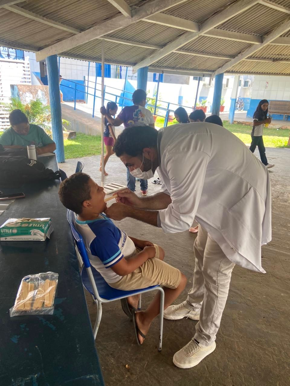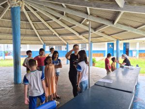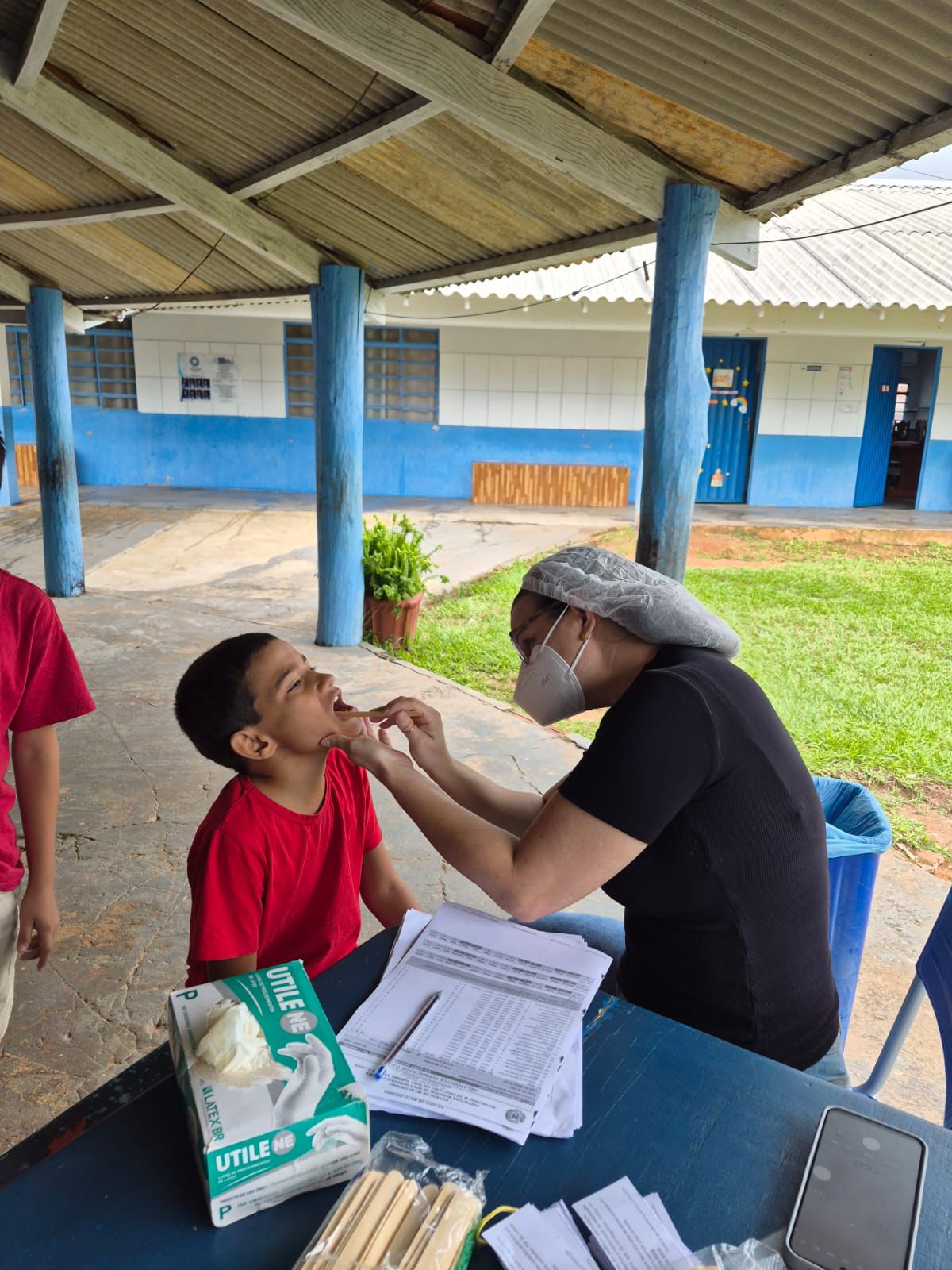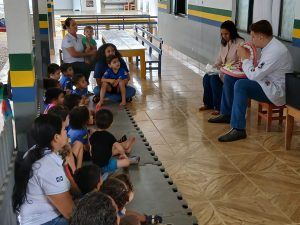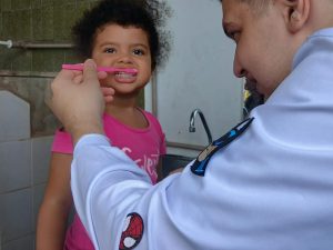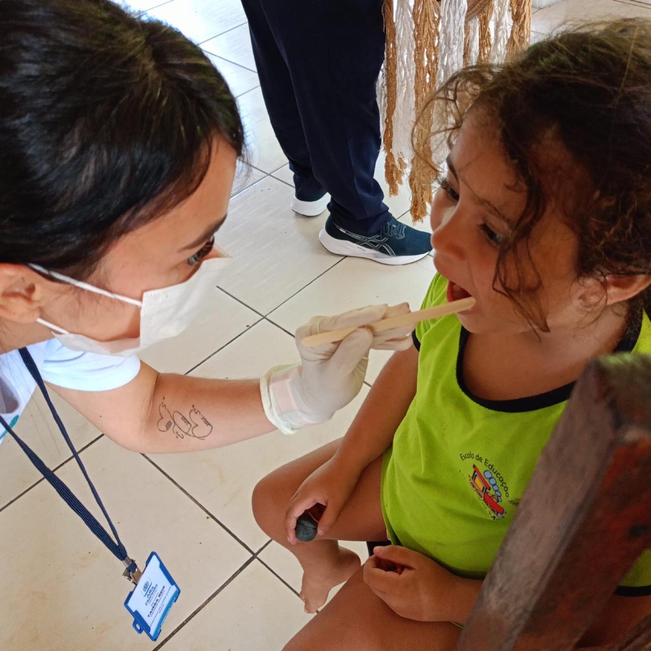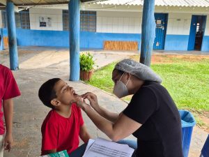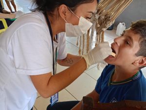 Foi realizada ação em saúde na escola do território, por meio do Programa Saúde na Escola (PSE), desenvolvido em parceria entre a equipe da Estratégia Saúde da Família e a instituição de ensino. Durante a atividade, foi realizada avaliação em saúde bucal nas crianças, com análise das condições dentárias, presença de cárie, necessidade de encaminhamento para tratamento odontológico e orientações sobre higiene oral.