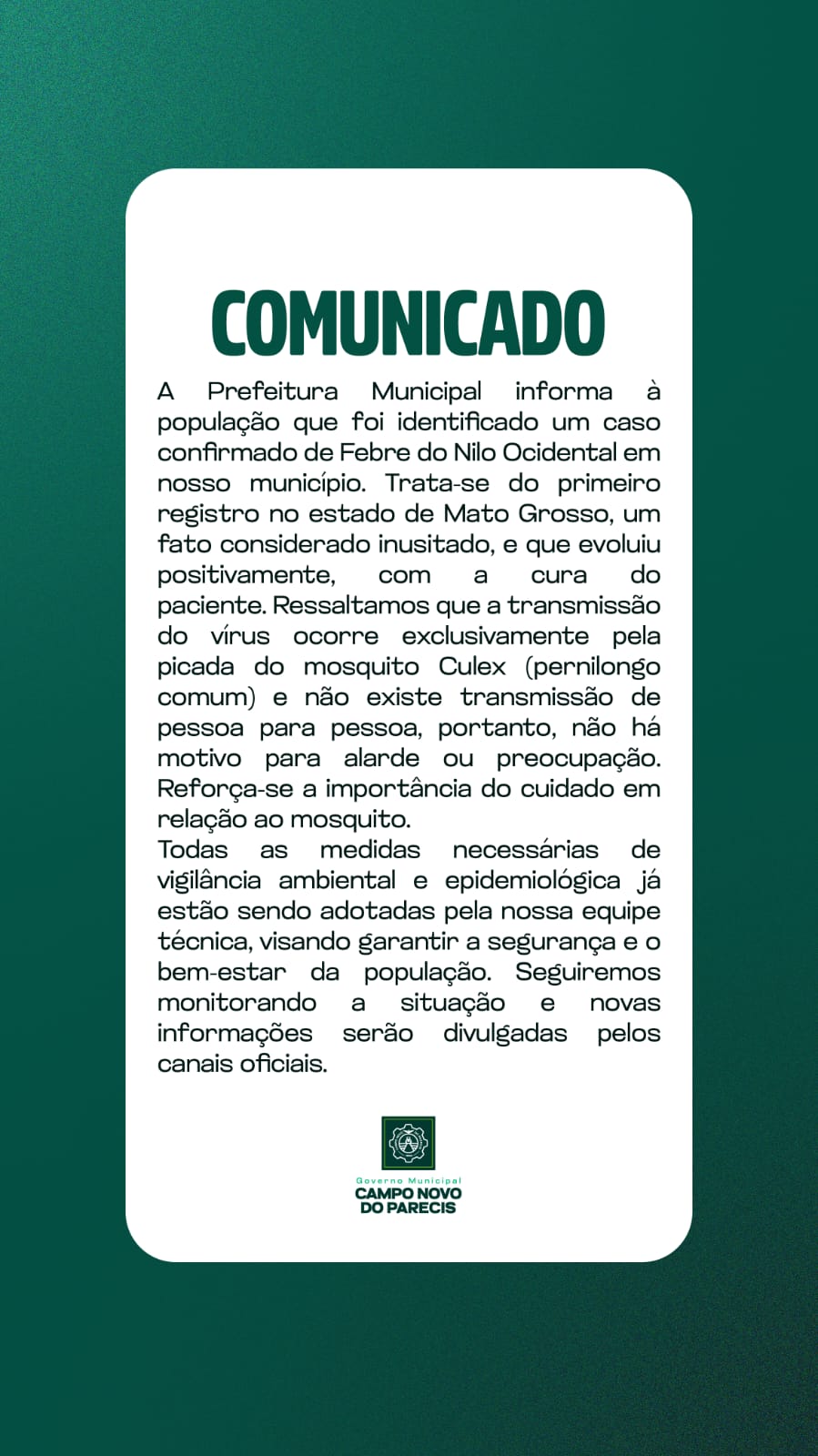 A Prefeitura informa que o paciente diagnosticado com Febre do Nilo Ocidental já está curado e passa bem. Reforça-se que não há transmissão de pessoa para pessoa, e todas as medidas de vigilância já estão sendo adotadas pela equipe técnica. Não há motivo para pânico. Segue-se monitorando a situação e mantendo a população informada pelos canais oficiais.