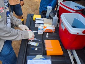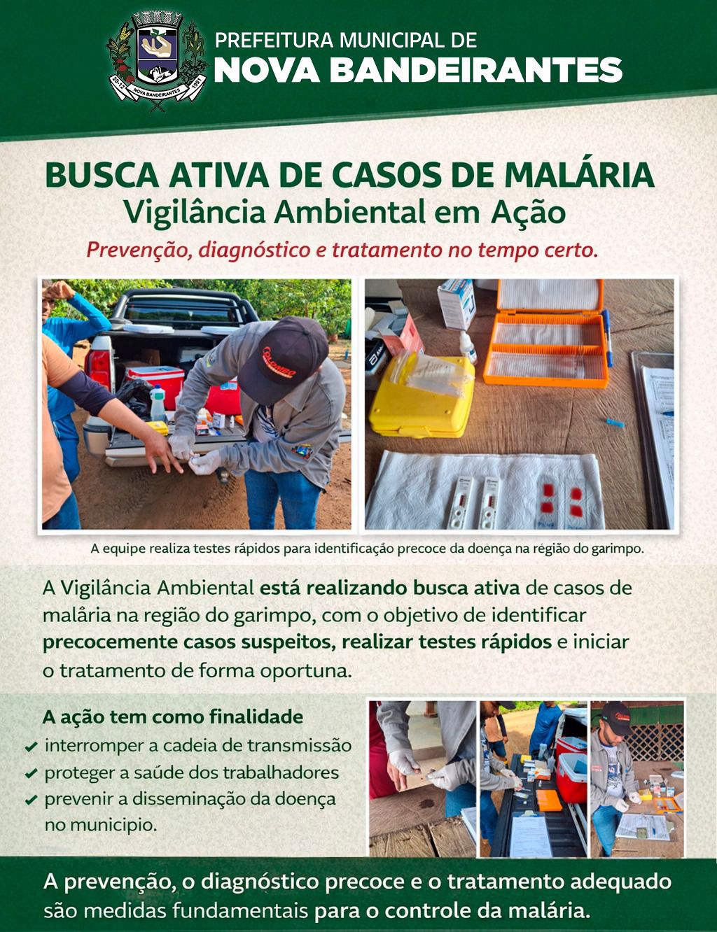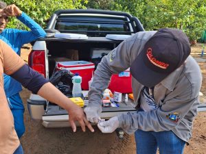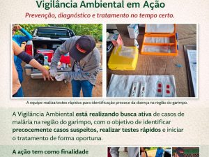 A Vigilância Ambiental está realizando busca ativa de malária na região do garimpo, com visitas in loco, orientação à população e encaminhamento para testagem quando necessário. A ação tem como objetivo identificar casos precocemente, interromper a transmissão e proteger a saúde dos trabalhadores e da comunidade.