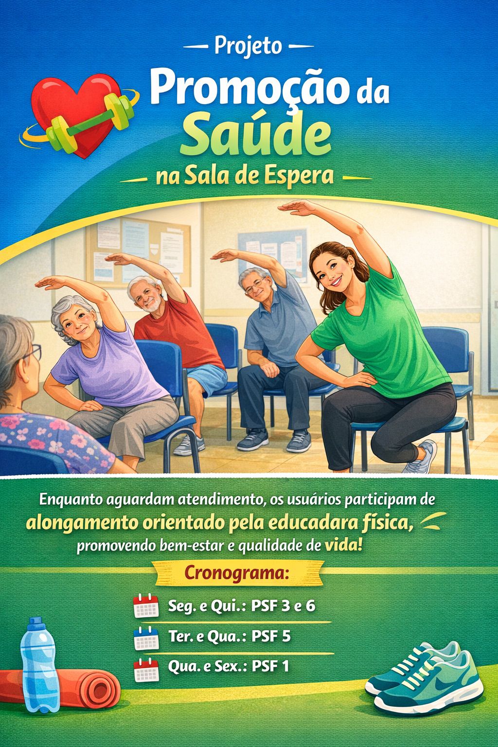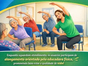 Foi organizado um cronograma de alongamentos na sala de espera das unidades, como parte de um projeto de promoção da saúde desenvolvido pela equipe e multi, incentivando bem-estar e qualidade de vida.