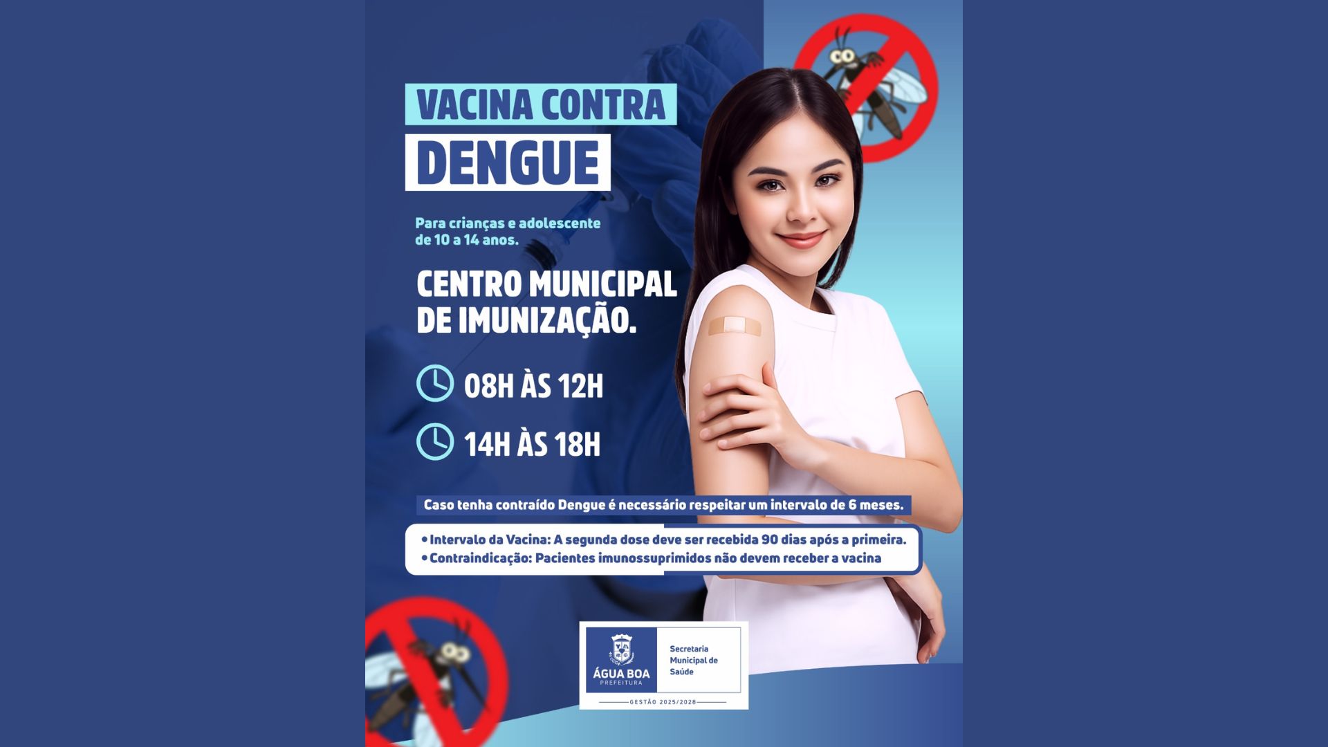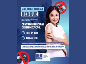 A Prefeitura de Água Boa informa que a vacinação contra a Dengue passa a ser ofertada, a partir desta sexta-feira (13), no Centro Municipal de Imunização. O público-alvo é formado por crianças e adolescentes de 10 a 14 anos, que deverão receber duas doses da vacina, com intervalo de três meses (90 dias) entre elas.