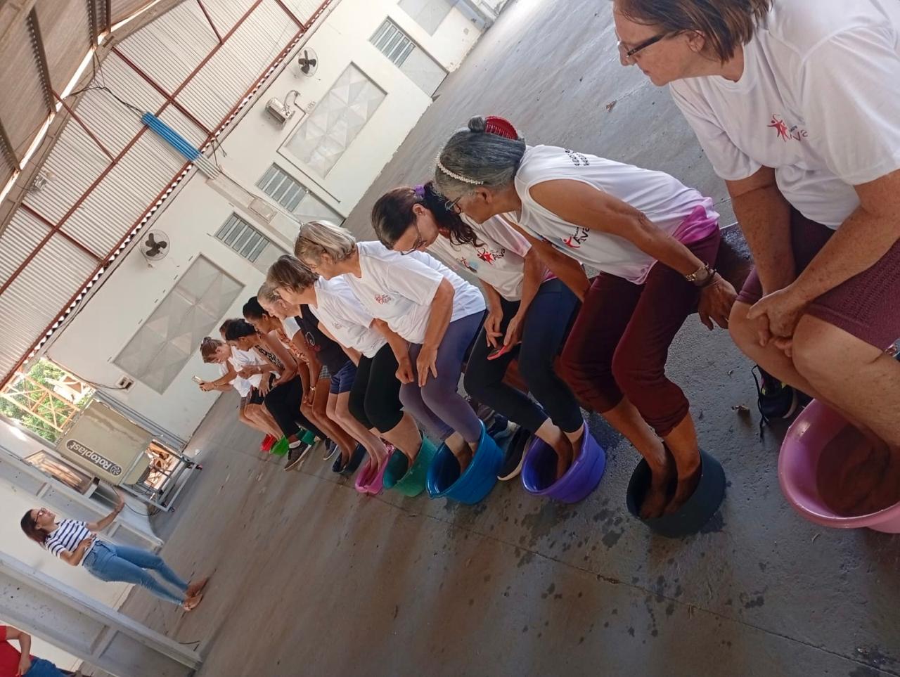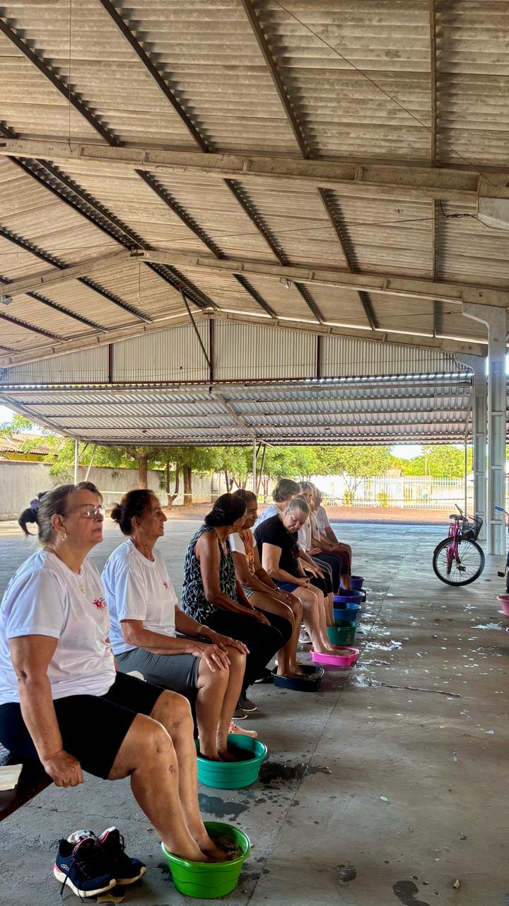 O encontro iniciou com uma breve prática de meditação guiada, conduzindo as participantes a um estado de calma e presença, contribuindo para a redução de tensões e da ansiedade. Em seguida, foi realizado um momento de escalda-pés com água morna e essências naturais, proporcionando alívio físico, conforto e uma sensação de acolhimento. A ação reforçou a importância do autocuidado, estimulou a convivência e proporcionou às idosas uma experiência agradável de relaxamento e tranquilidade.