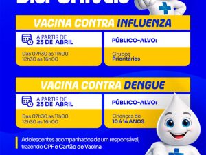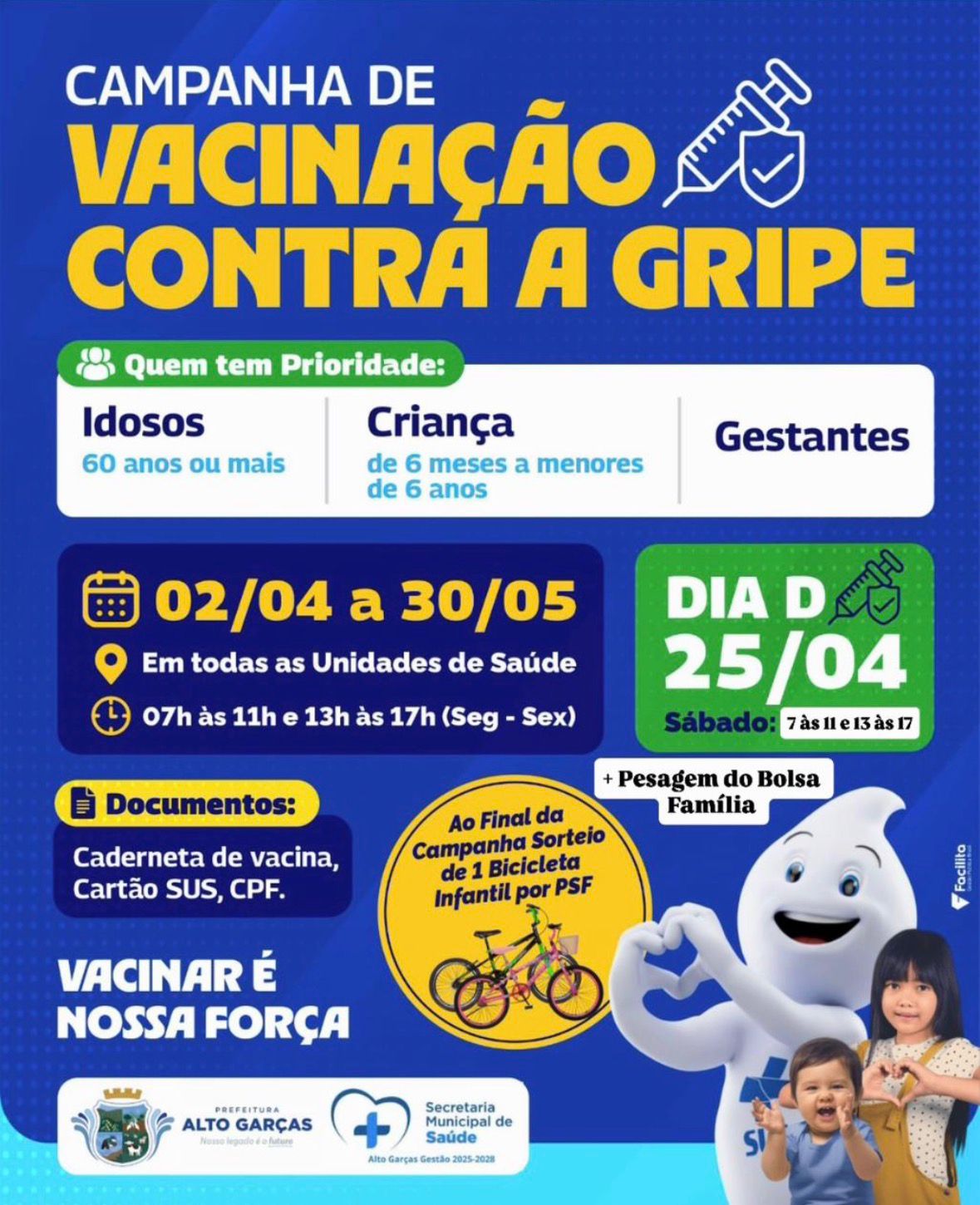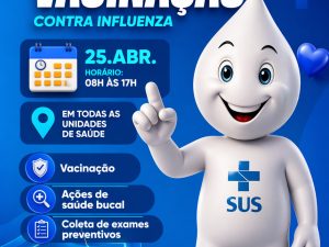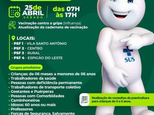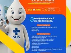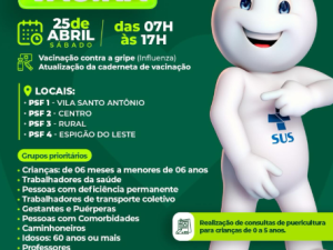 Neste sábado, 25 de abril, é dia de cuidar da saúde! Das 07h às 17h, todas as unidades estarão abertas para vacinação contra a gripe e atualização da caderneta.