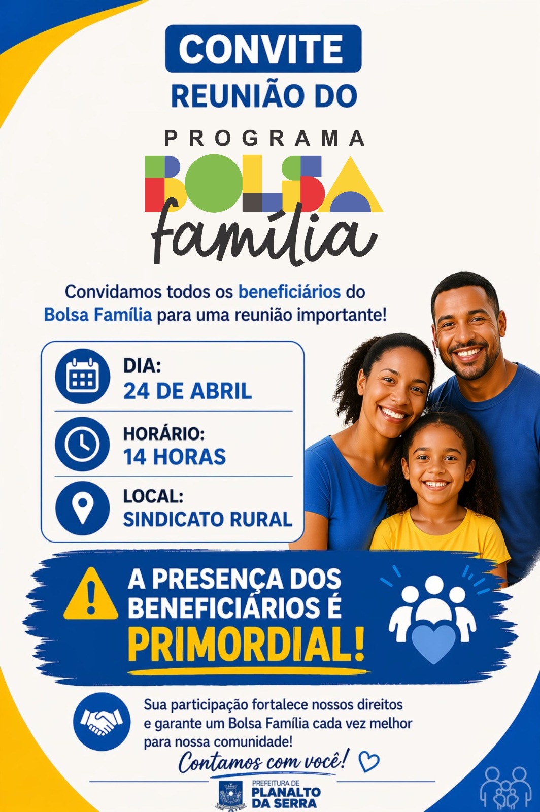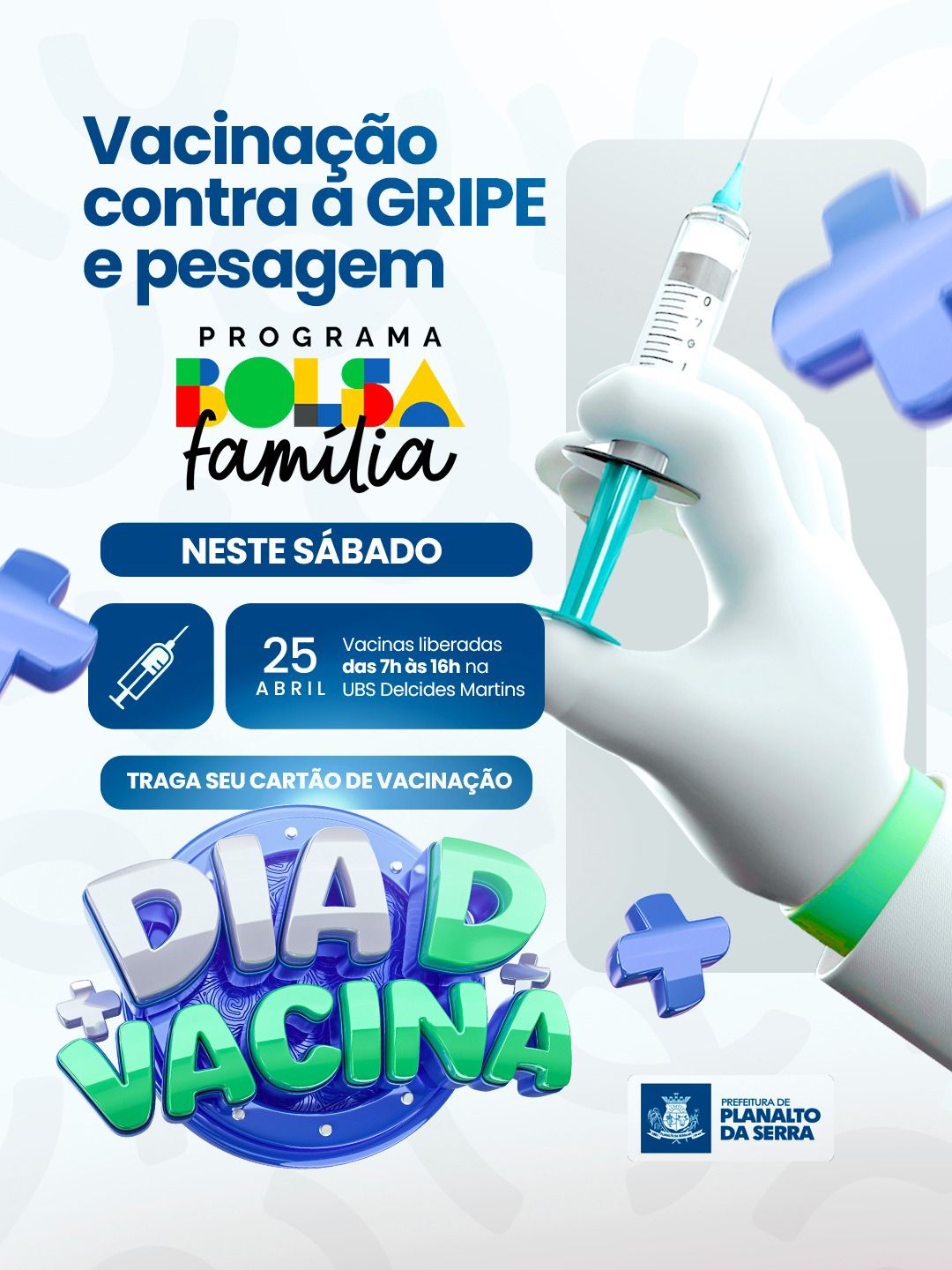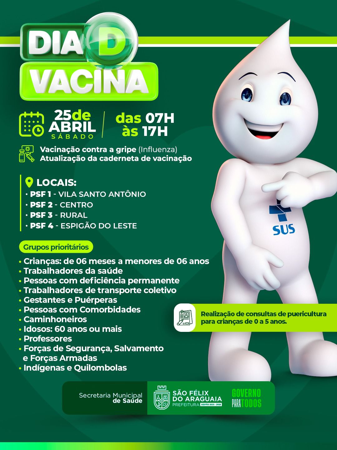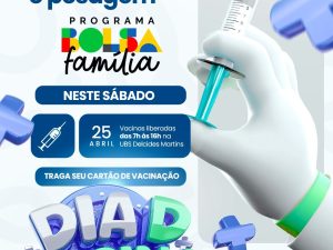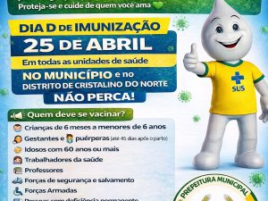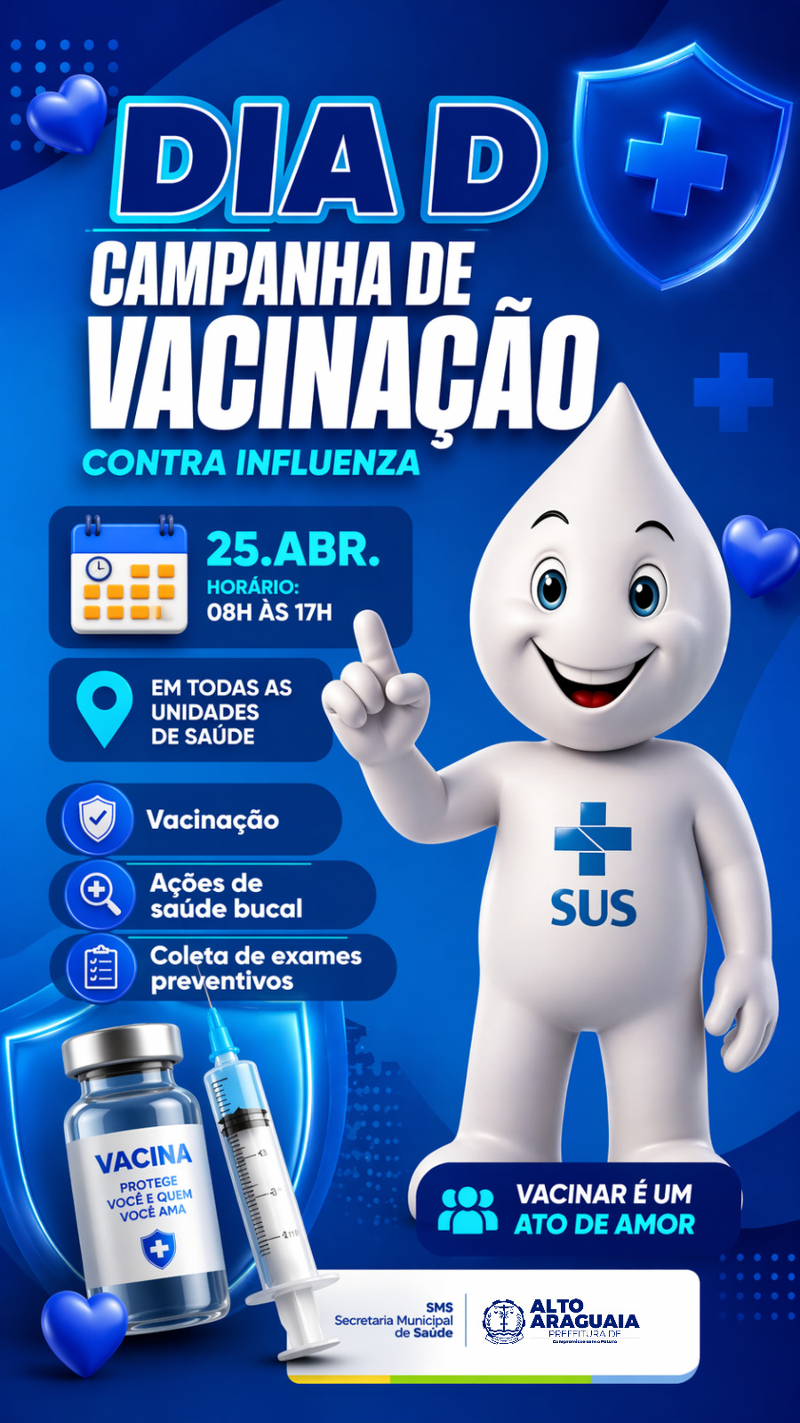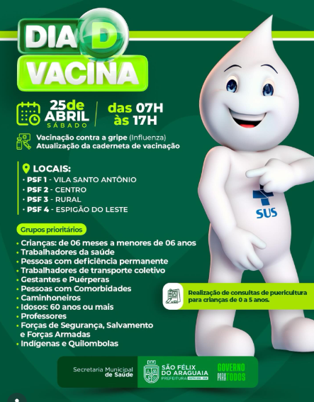 Dia D da Vacinação está chegando! A Prefeitura, por meio da Secretaria de Saúde, convida você e sua família para um momento especial de cuidado e prevenção. Sábado, 25 de abril, das 13h às 18h no Estacionamento ao lado da UPAM.