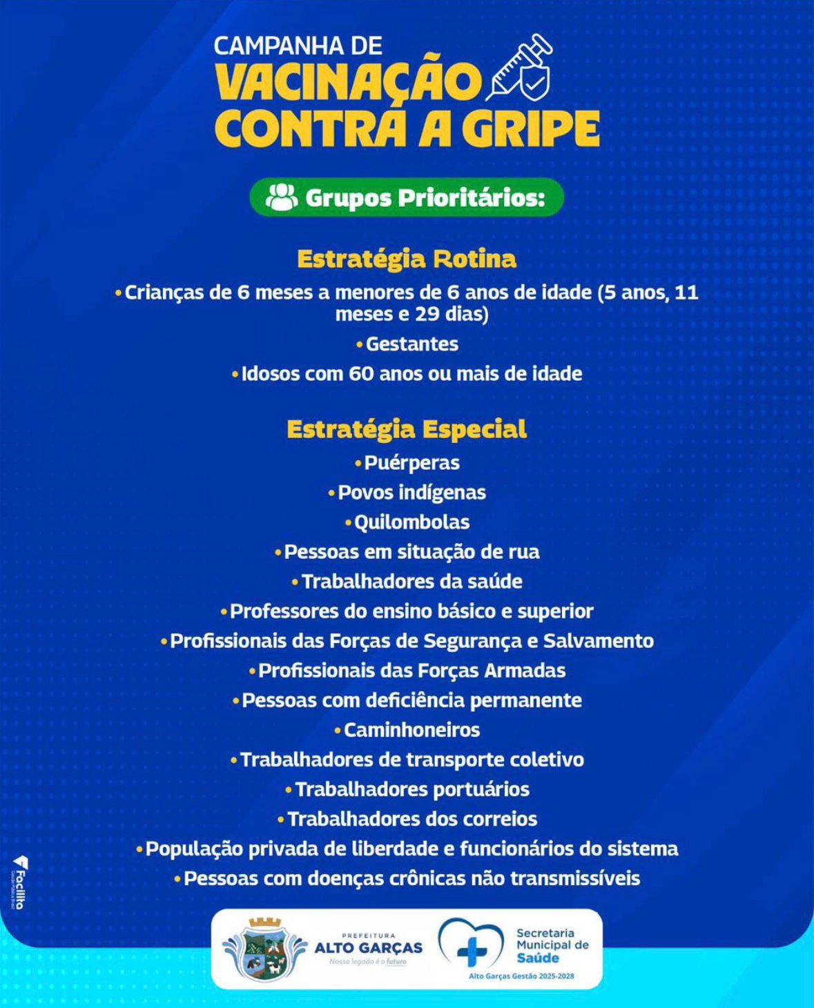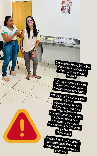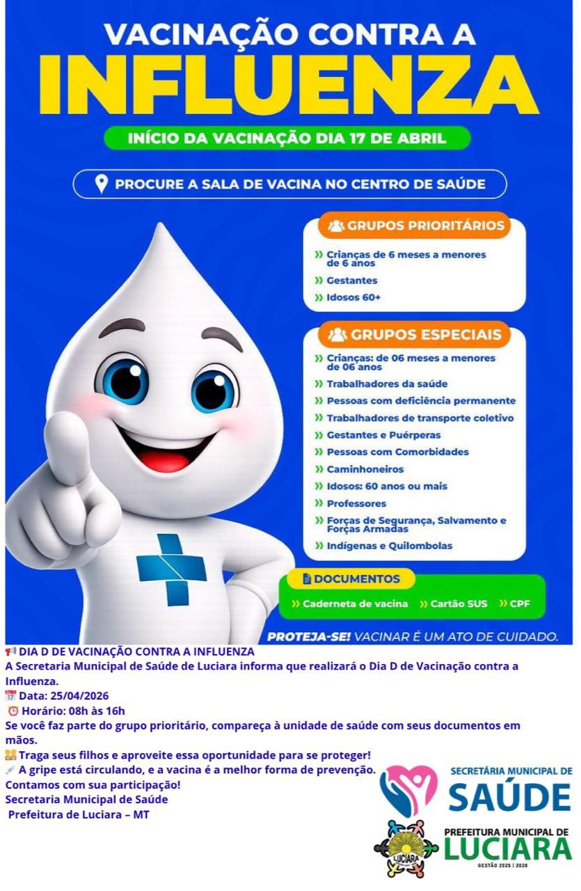 Neste sábado é Dia D de Vacinação contra a Influenza em Juína! Proteja-se e ajude a cuidar de quem você ama. A vacinação é uma das formas mais eficazes de prevenção contra a gripe e suas complicações. Procure a unidade de saúde e participe!