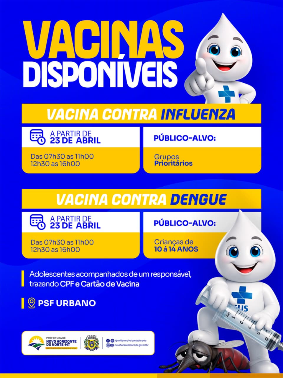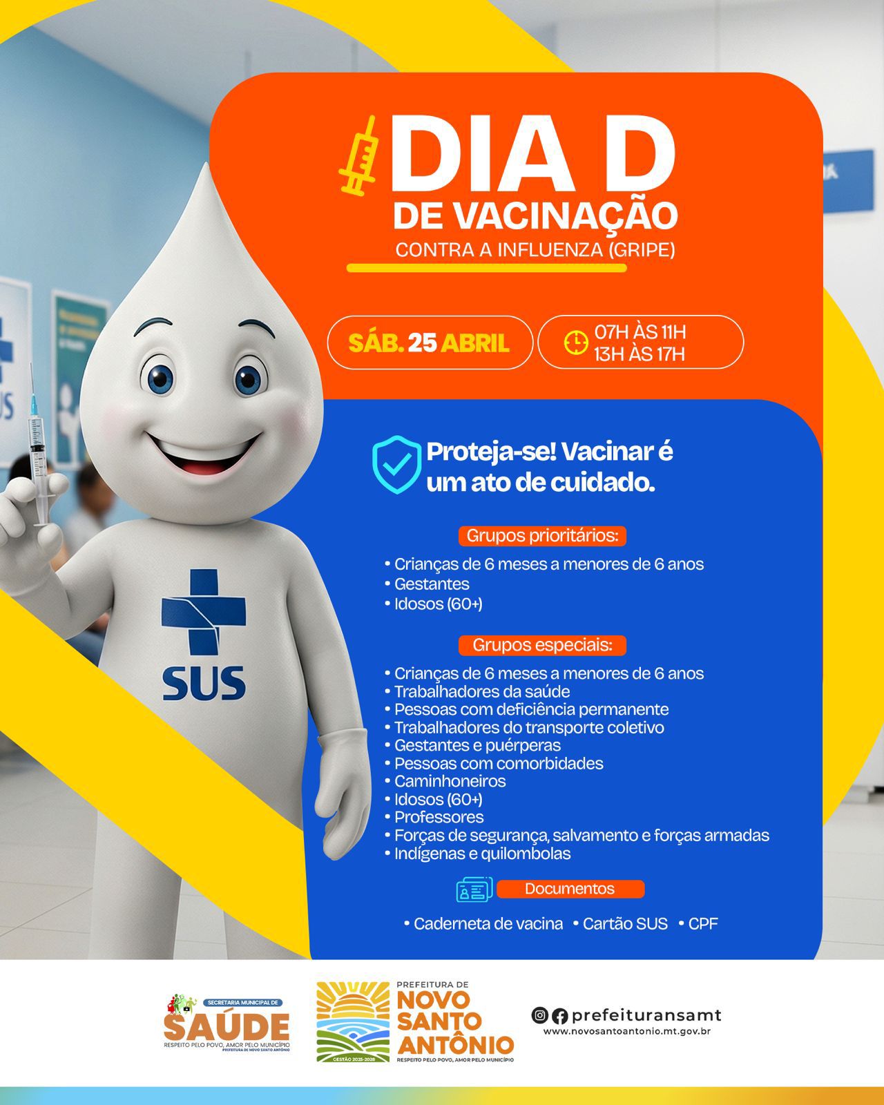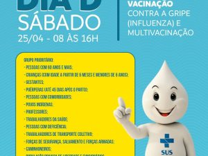 Neste sábado é dia de cuidar da saúde. 25/04 (sábado), das 08h às 16h, Sala de Vacina. Dia D de Vacinação contra a gripe (influenza) e multivacinação.